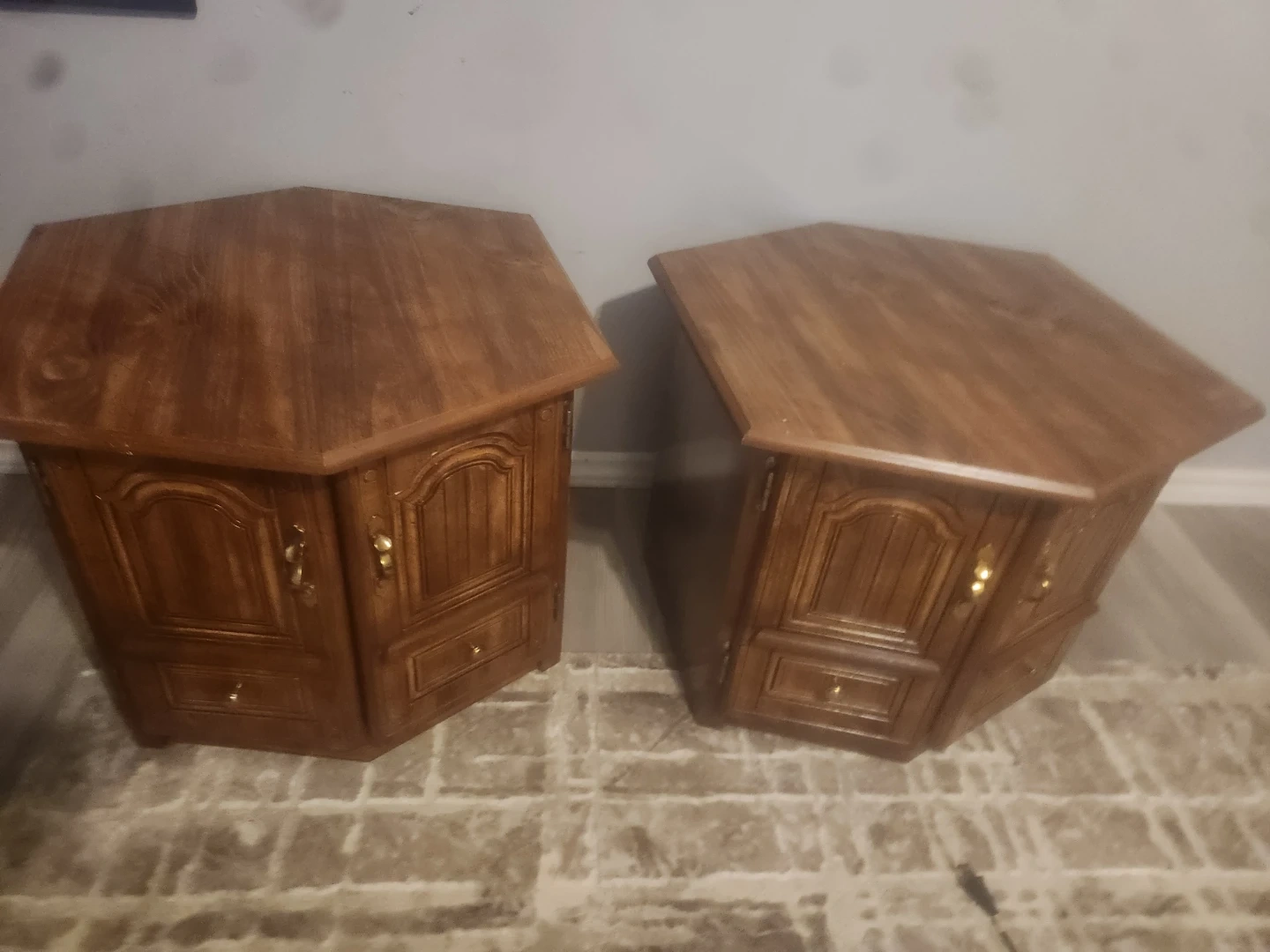 A set of two vintage wooden corner cabinets. Each cabinet features a paneled door and a drawer for storage. Rich wood finish with brass hardware. They're great for adding extra storage and a classic touch to any room!