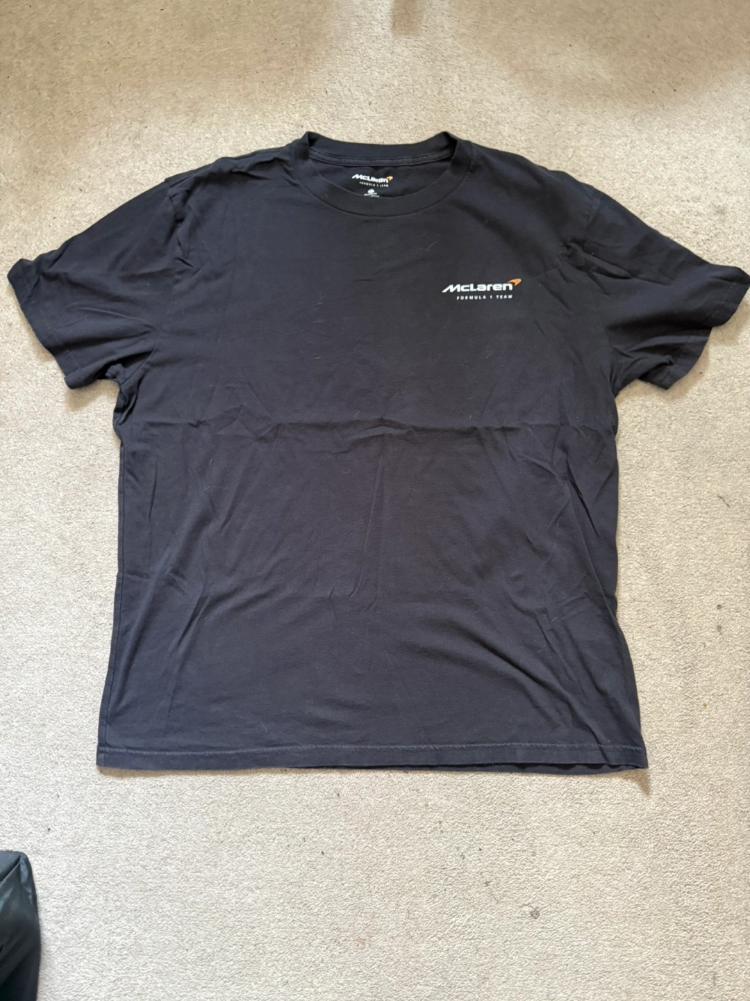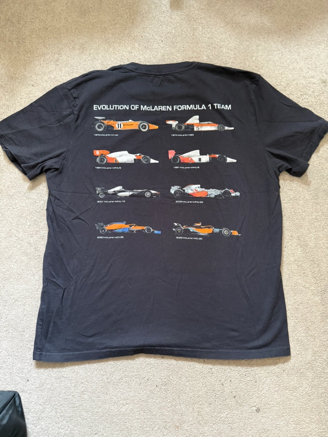 Black t-shirt. Features McLaren Formula 1 Team logo on the front and evolution of McLaren Formula 1 cars on the back. Relaxed fit. Made in Vietnam.
