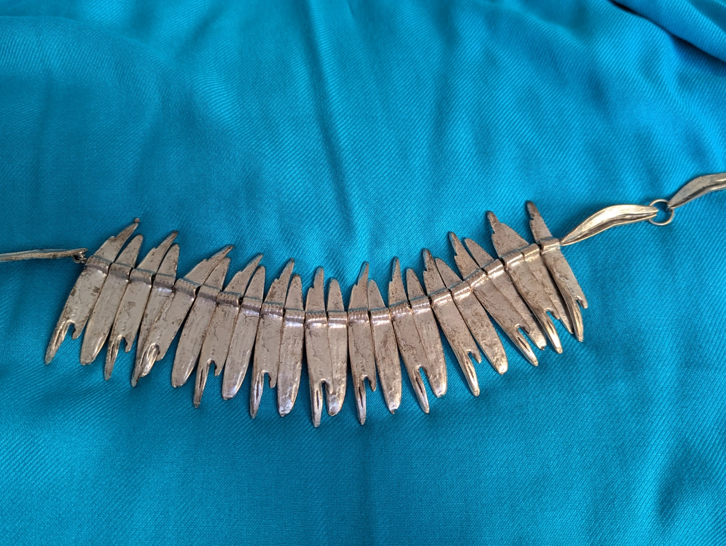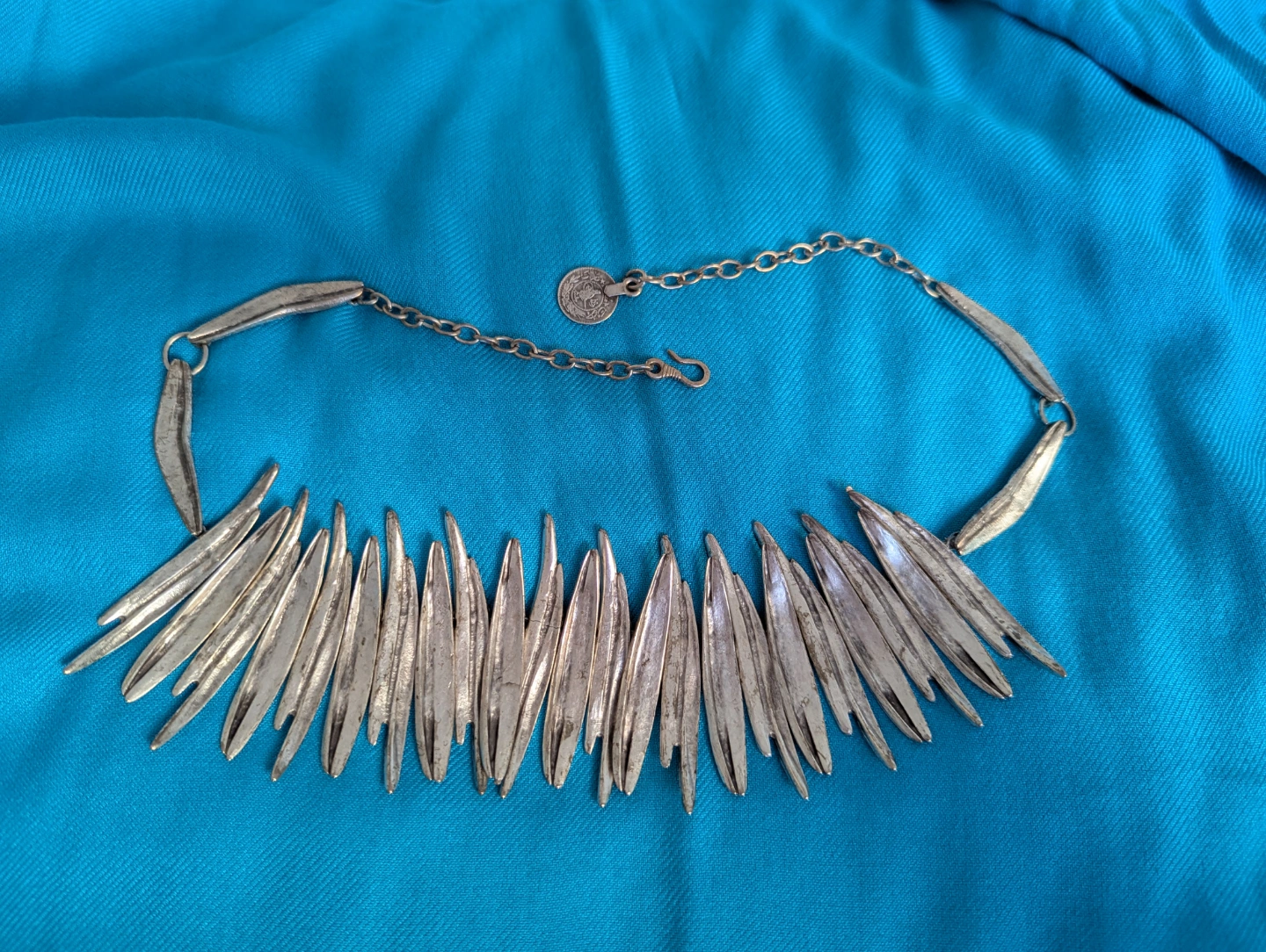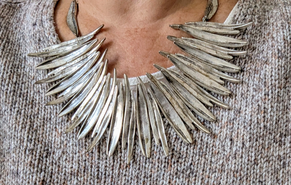 Unique silver plated necklace. Many individual pieces form a striking zen collar. adjustable with hook fastener