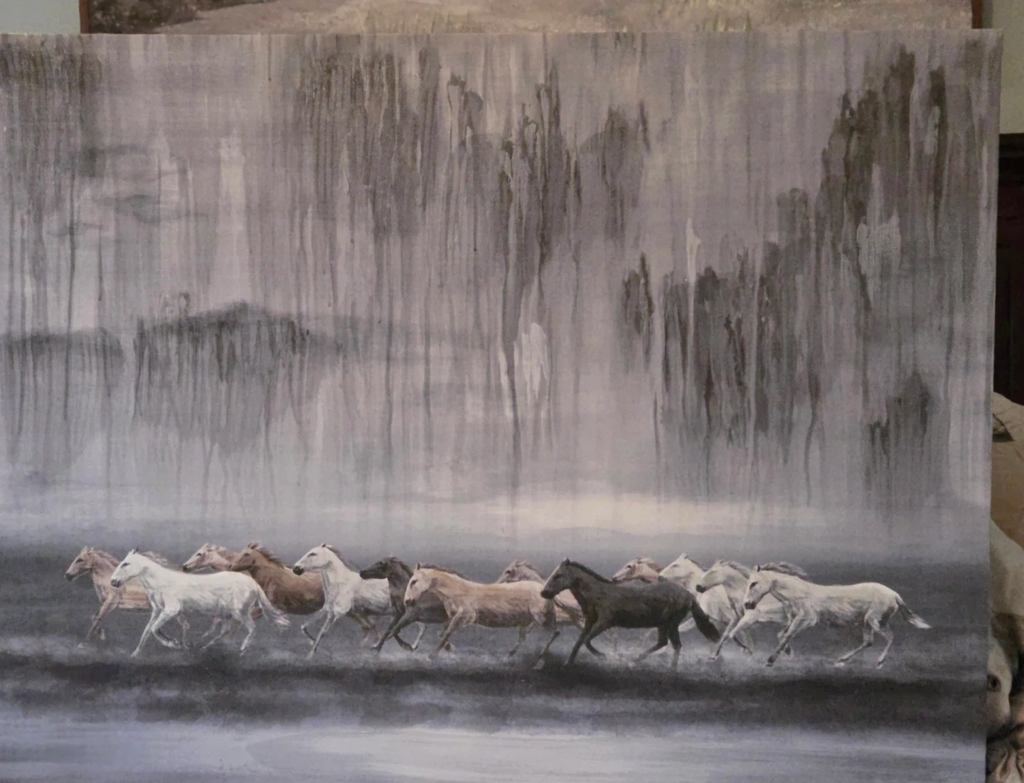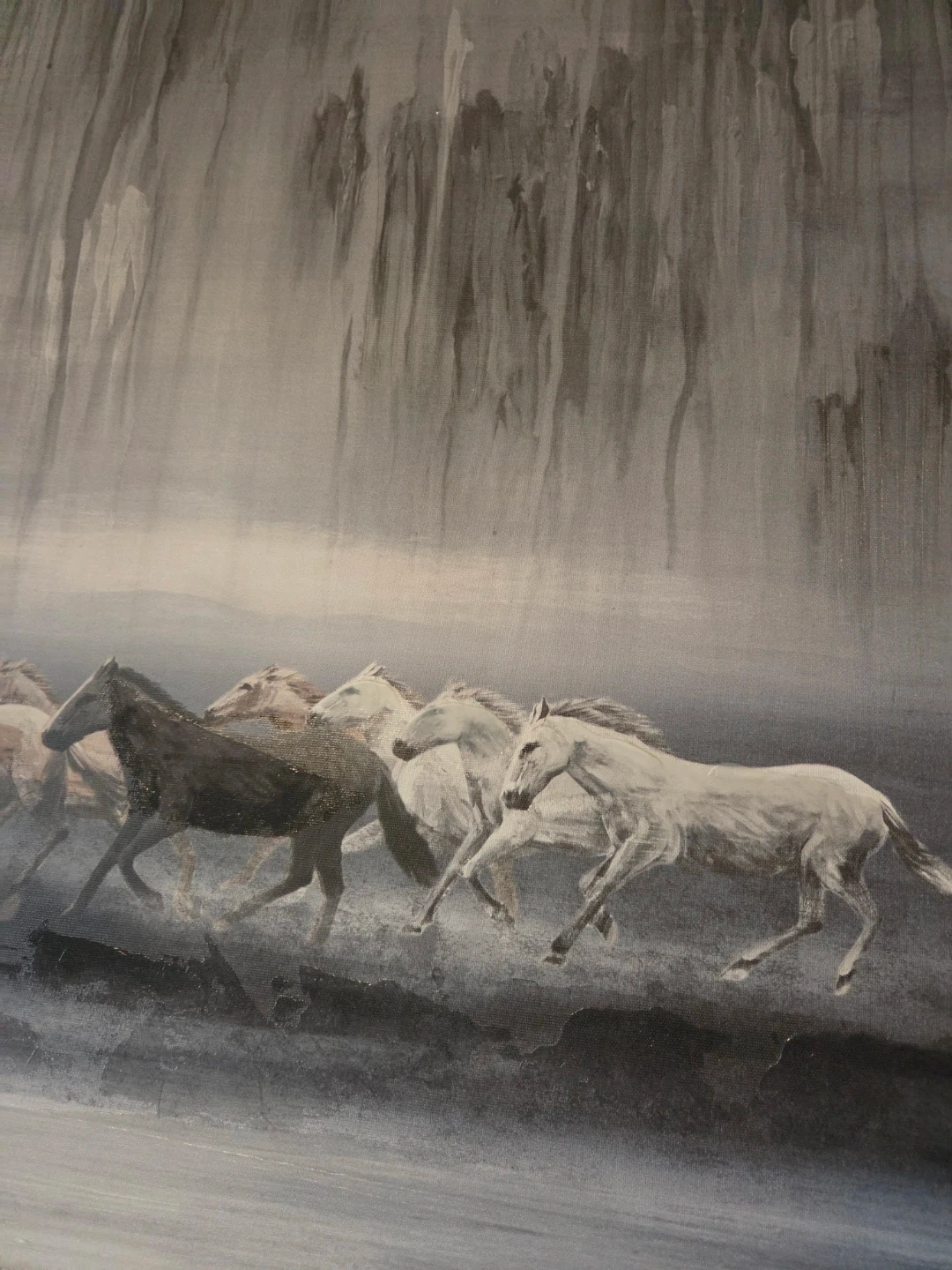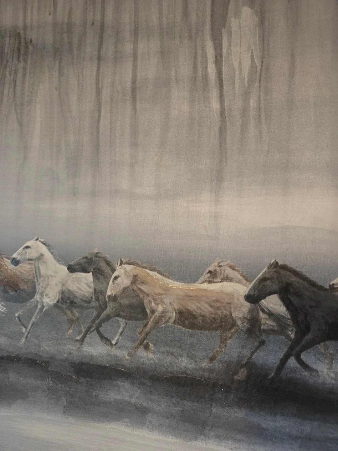 This is an original acrylic painting on canvas, depicting a herd of horses running. The artwork features a monochromatic palette with shades of grey and white. It's a large statement piece for any home or office. Size: 40" wide x 30" height.