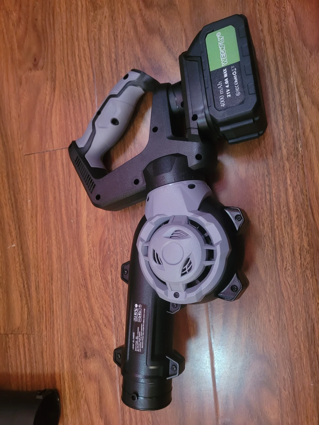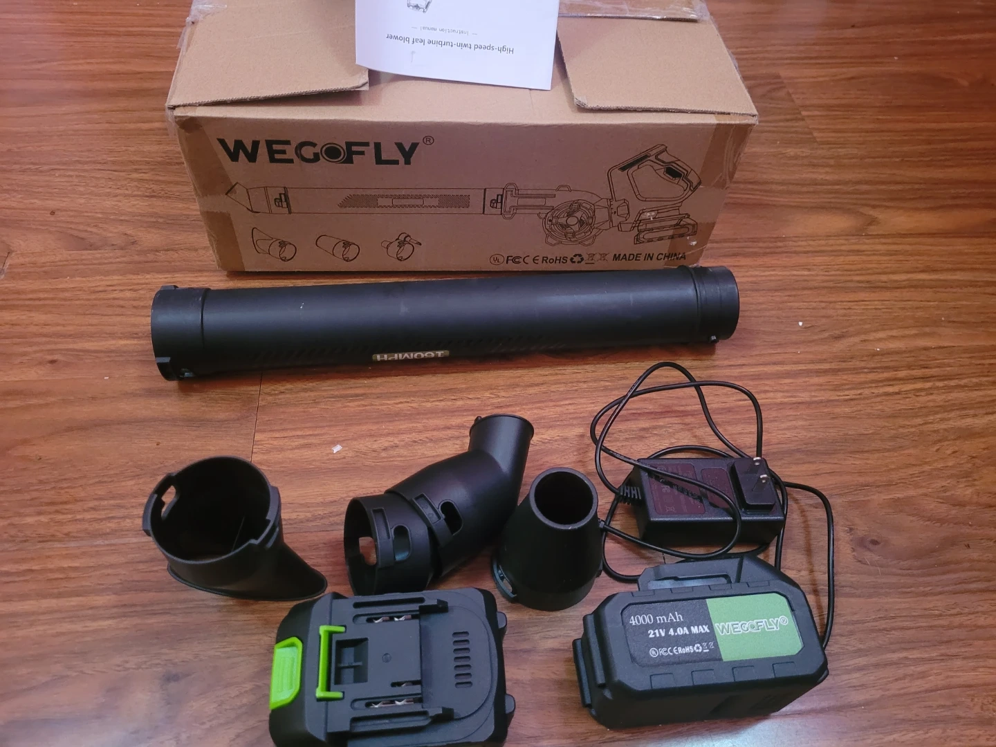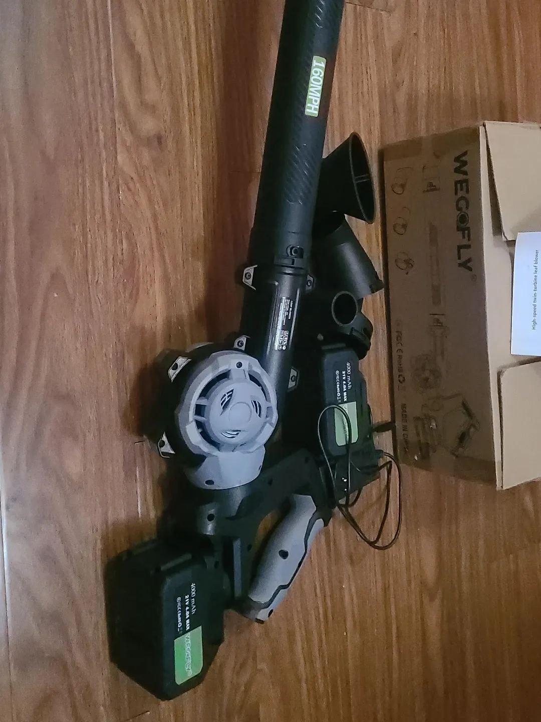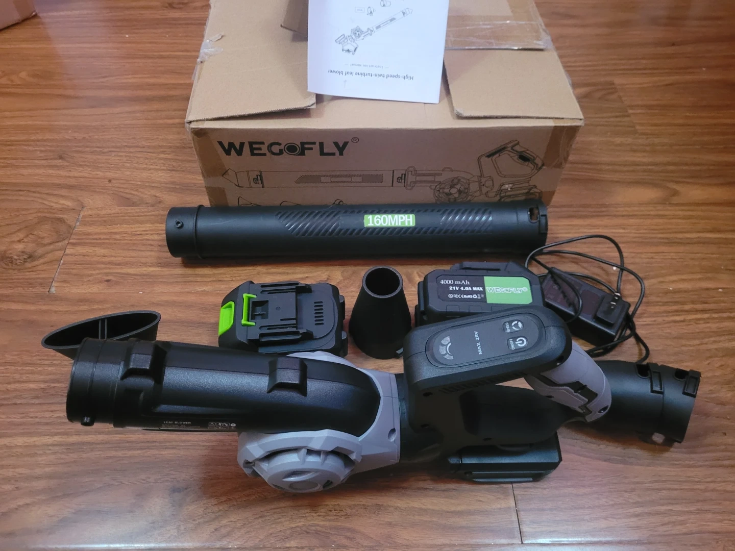 WEGOFLY cordless leaf blower with two 21V 4.0Ah batteries. Includes charger and multiple nozzle attachments. It offers 160 MPH wind speed.