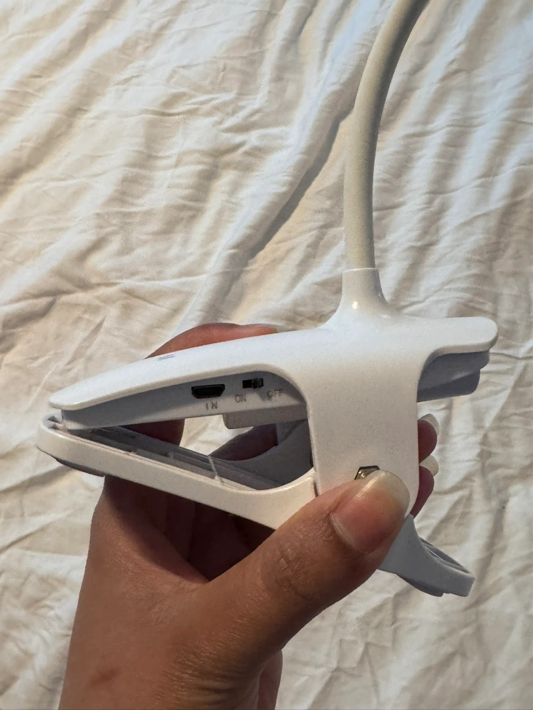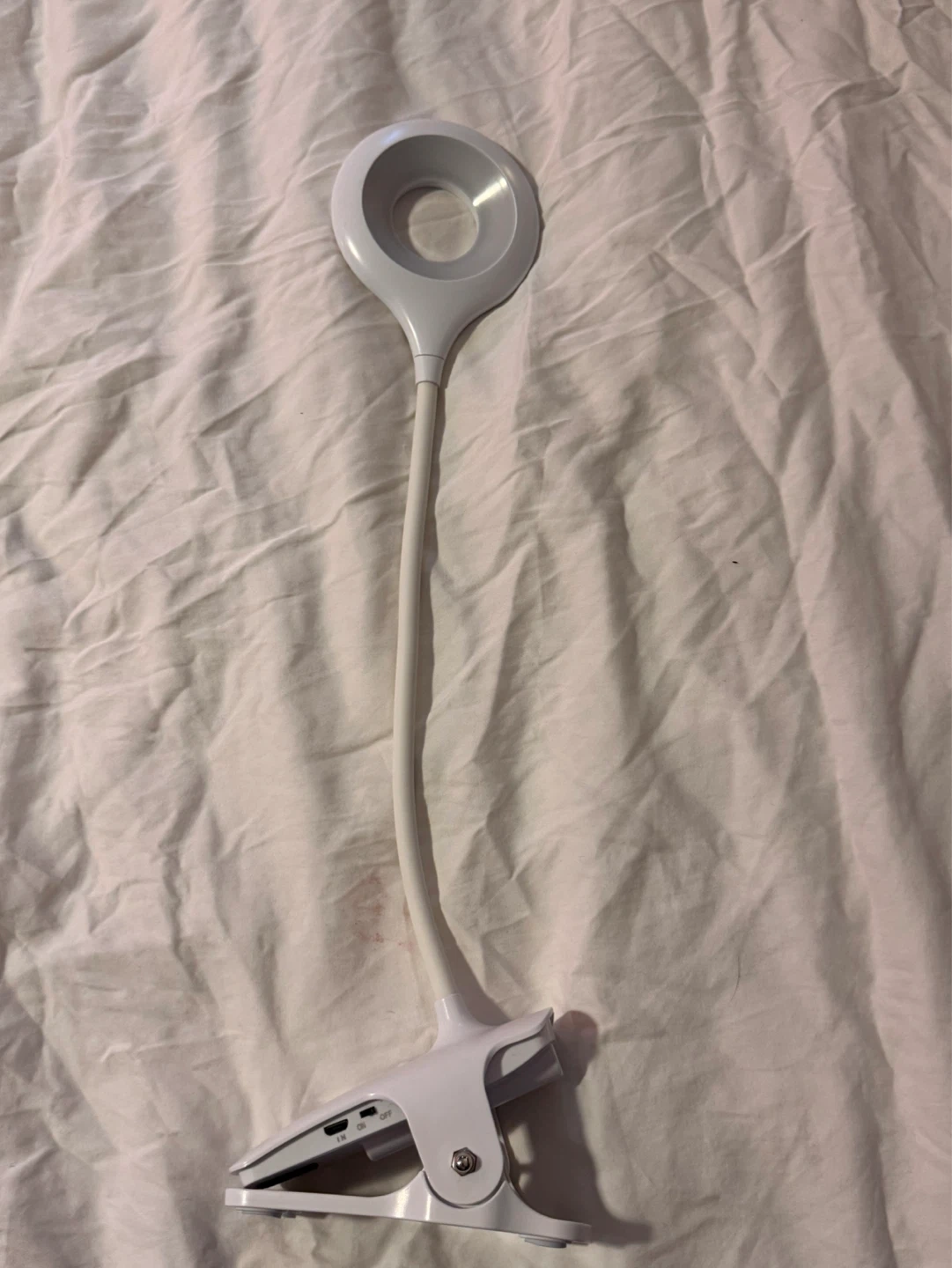 This is a white clip-on LED desk lamp with a flexible gooseneck. It features a USB charging port and an on/off switch. There are buttons for brightness adjustment and mode selection. It's great for reading or working at your desk.