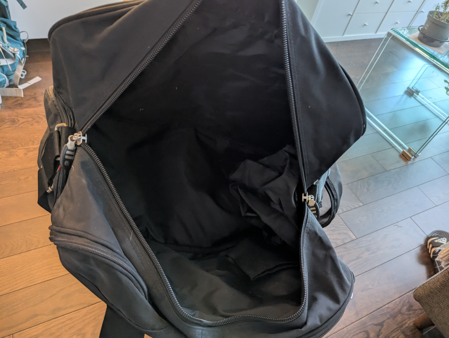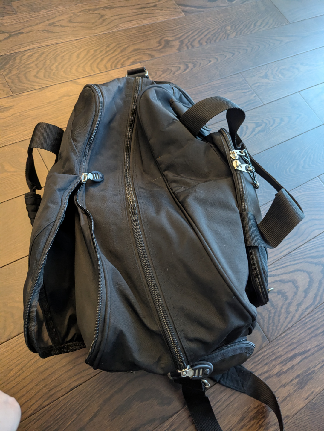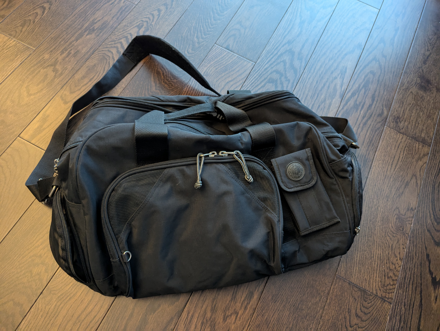 All black Stormtech black duffle bag, heavy duty zippers, multiple pockets