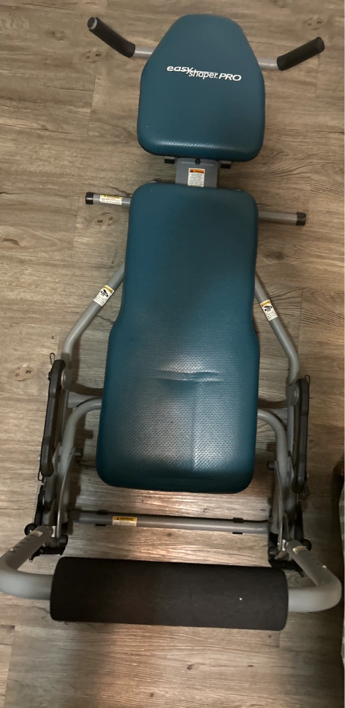 This is an Easy Shaper Pro abdominal exerciser. It's a teal blue colour with grey metal framing. The seat and headrest are padded for comfort.
