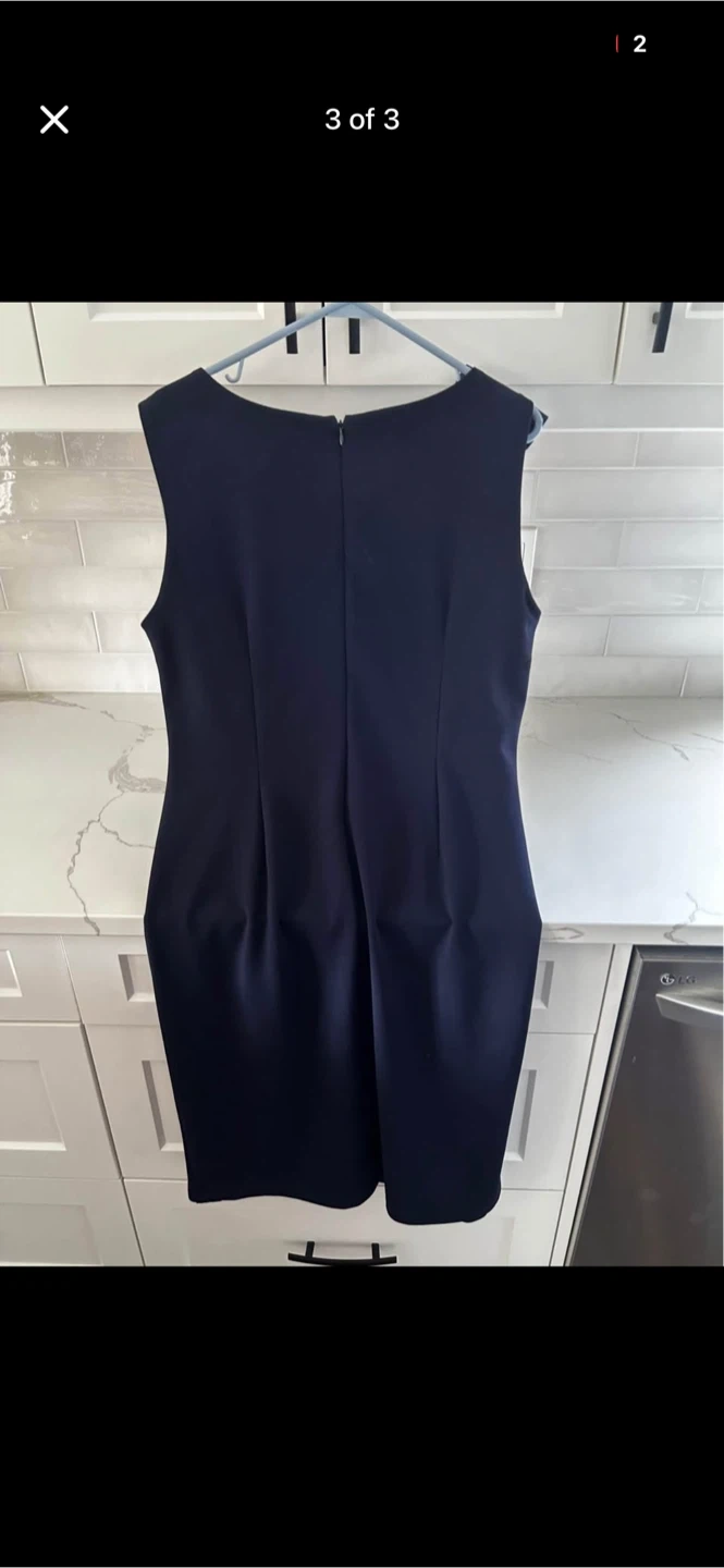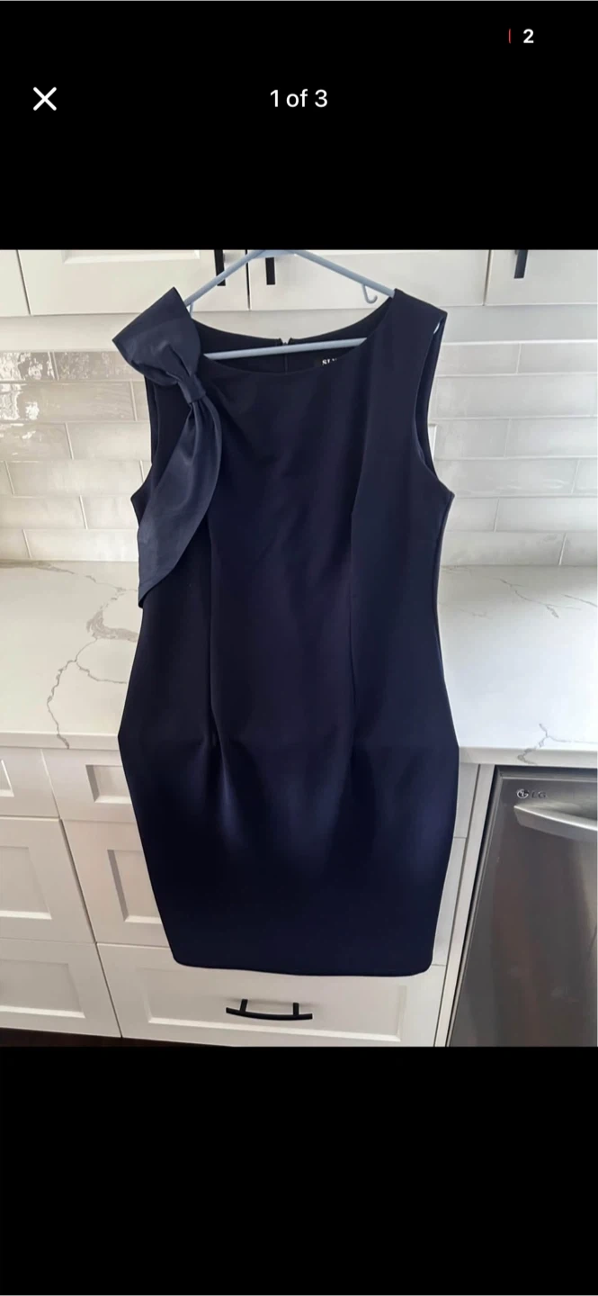 Sleeveless navy blue dress with a decorative bow on the left shoulder. It's a chic choice for various occasions. Zipper closure at the back.