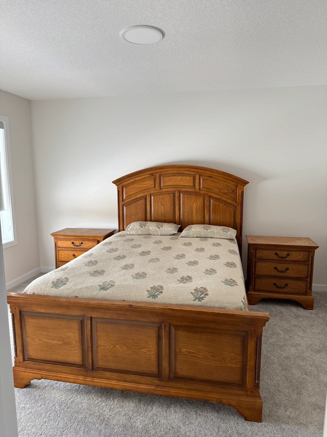 Beautiful solid wood queen bed frame set. Includes matching headboard, footboard, and two nightstands. This set offers a classic and durable addition to any bedroom. Wood construction ensures long-lasting quality.