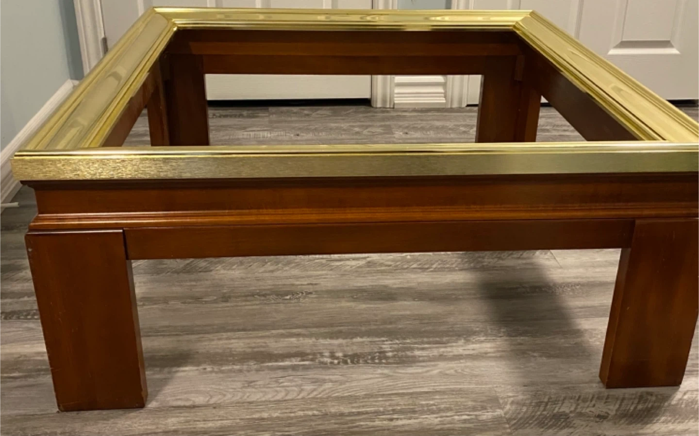 Selling a sturdy coffee table with a unique design. It features a rich wood finish and a striking gold trim. Tempered glass top. Perfect for adding a touch of elegance to your living room!