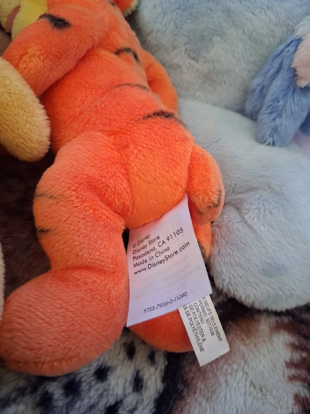 Set of Disney Store Winnie the Pooh characters. Includes Pooh, Tigger, Piglet, and Eeyore. Made with polyester and other materials. Perfect for young fans!
