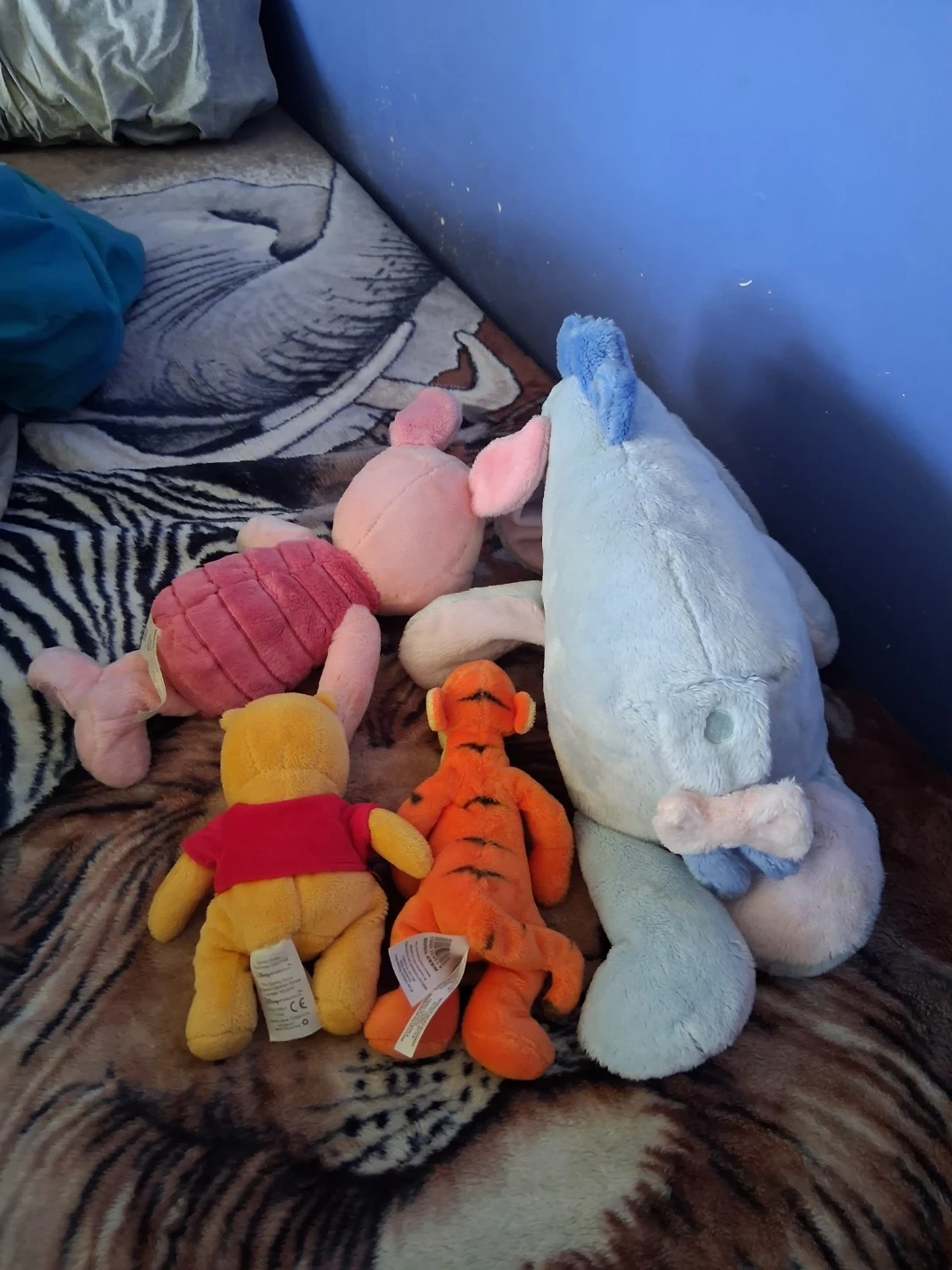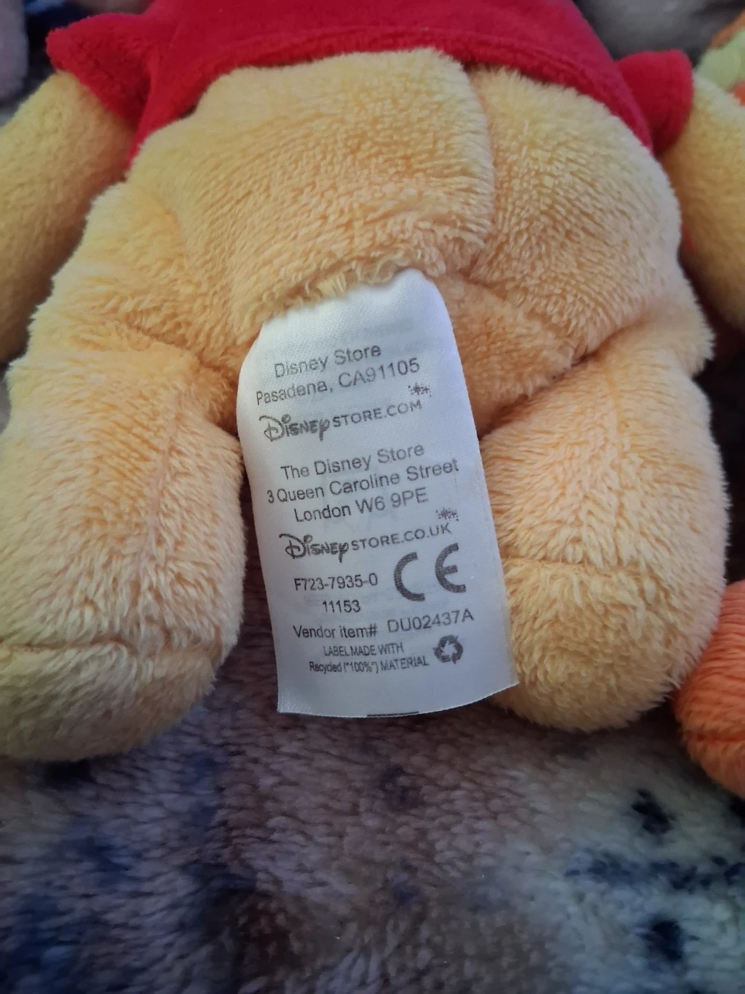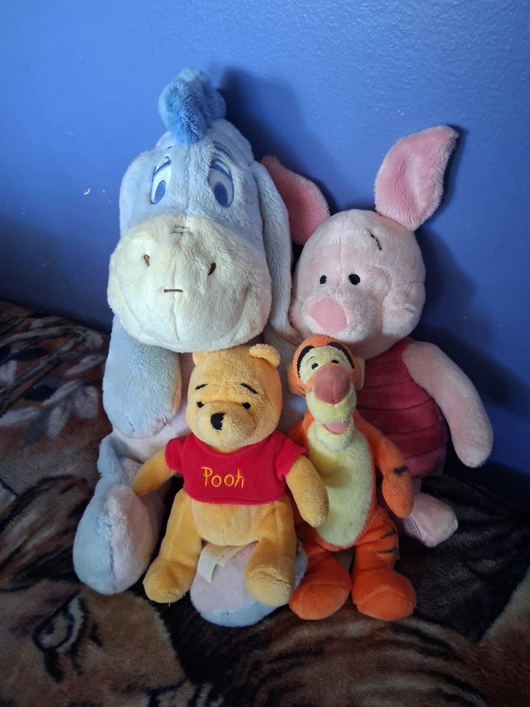 Set of Disney Store Winnie the Pooh characters. Includes Pooh, Tigger, Piglet, and Eeyore. Made with polyester and other materials. Perfect for young fans!
