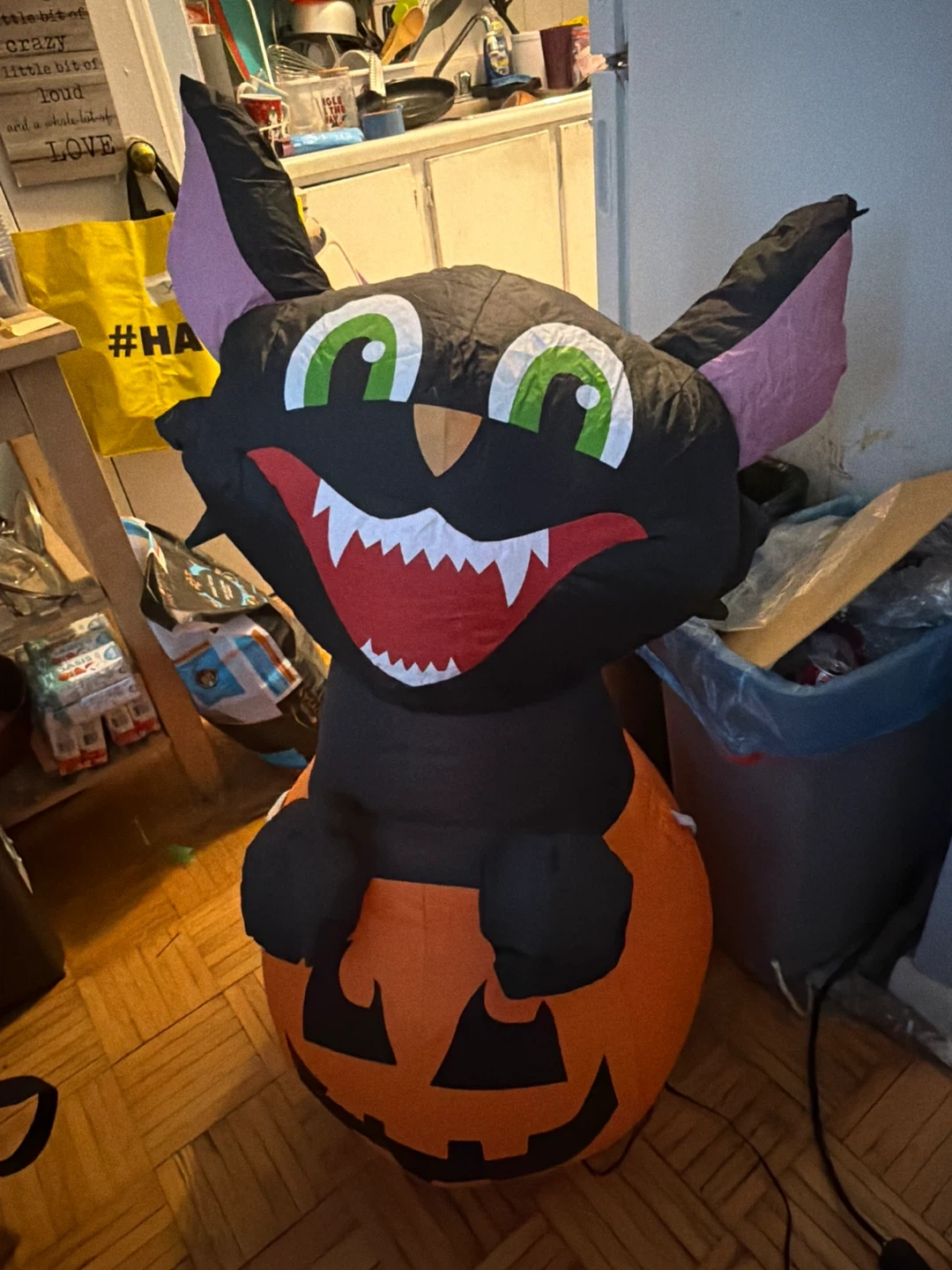 Spooky and fun inflatable Halloween decoration! It's a black cat sitting on top of a pumpkin, perfect for adding some festive cheer to your yard this Halloween