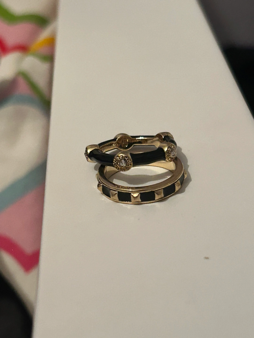 Selling a set of Henri bendel designer hewellery stackable rings. They're gold with black enamel detailing. A super cute addition to any outfit! They’re real gold and vintage too!