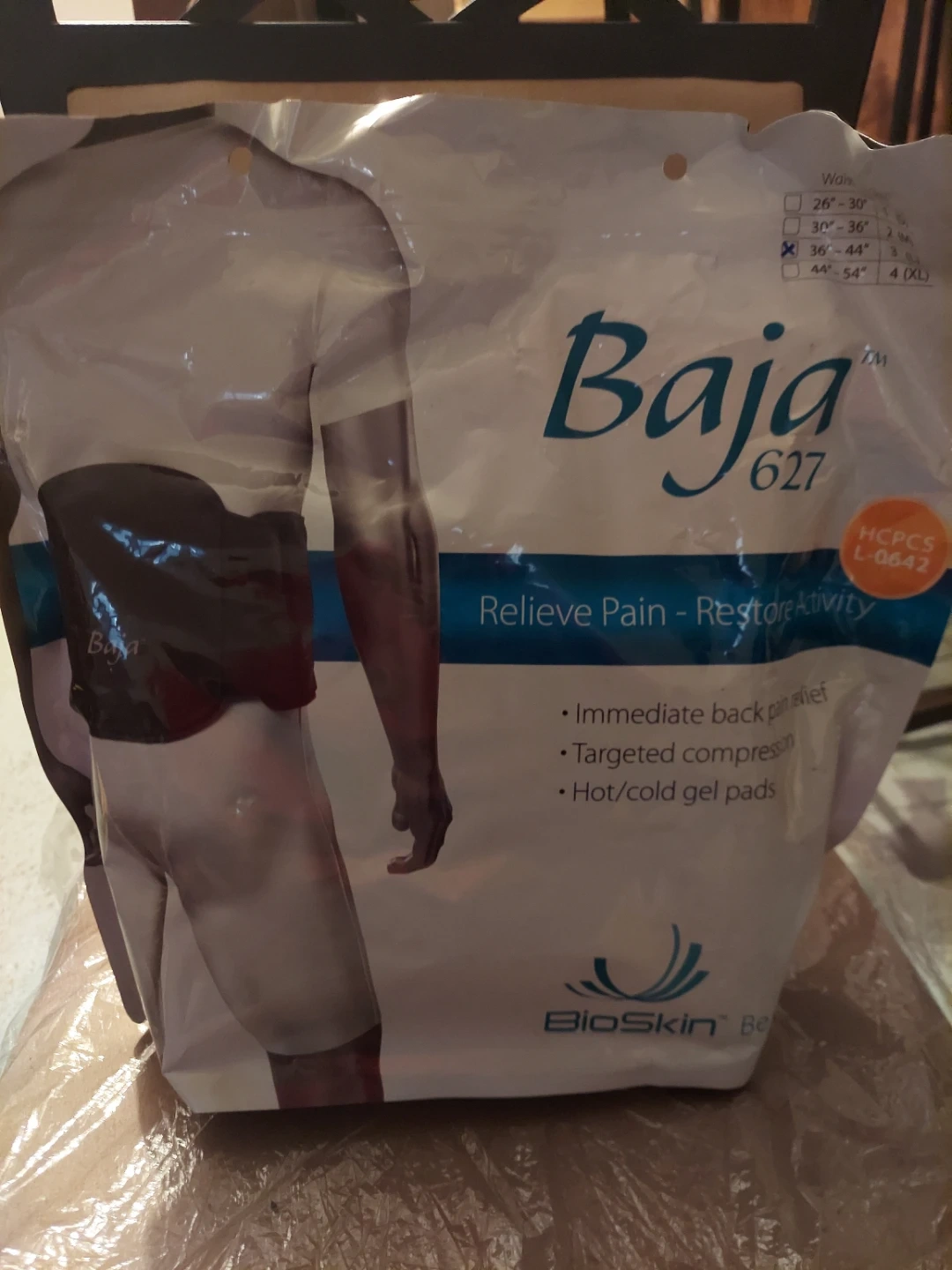 This is a BioSkin Baja 627 back brace. It's designed to relieve pain and restore activity. It offers immediate back pain relief with targeted compression and includes hot/cold gel pads. Waist size is 44-54 inches (XL).