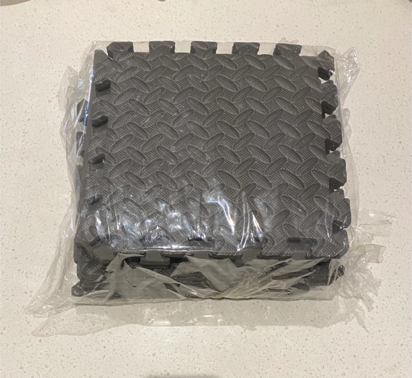 A set of dark grey interlocking foam floor mats with a textured pattern. These mats are made of EVA foam for cushioning. They connect easily to cover larger floor areas. Measure 12” x 12” each. 1/2” thick. New, never used. Pick up at Weston and Eglinton.