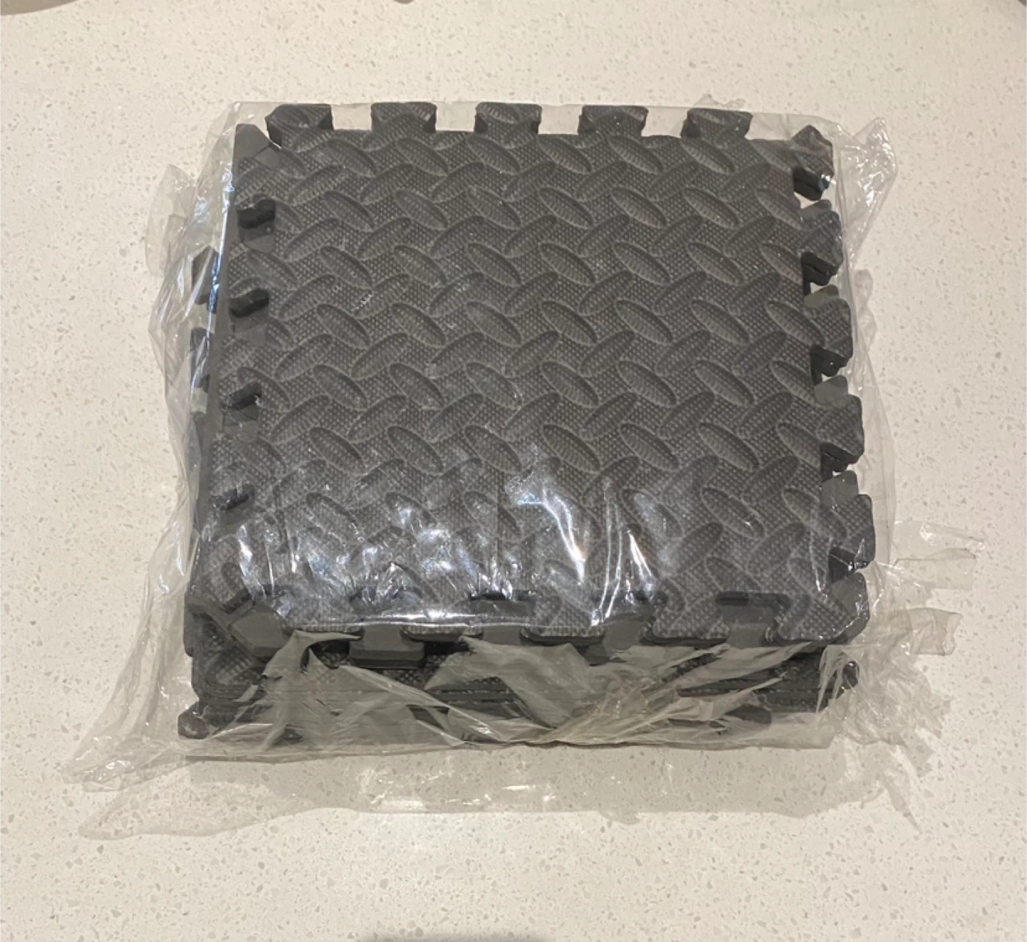 A set of dark grey interlocking foam floor mats with a textured pattern. These mats are made of EVA foam for cushioning. They connect easily to cover larger floor areas. Measure 12” x 12” each. New, never used. Pick up at Weston and Eglinton.