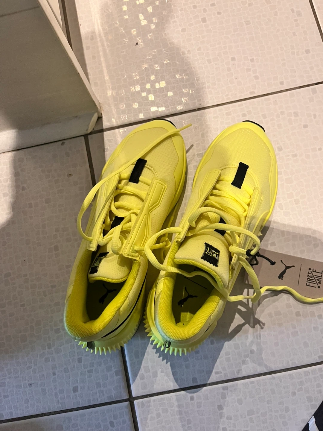 These Puma First Mile running shoes are in excellent condition and ready for your next run! The bright yellow colour will definitely make you stand out. They are lightweight and portable, perfect for taking on the go. Comes with the original box. Size 38/39