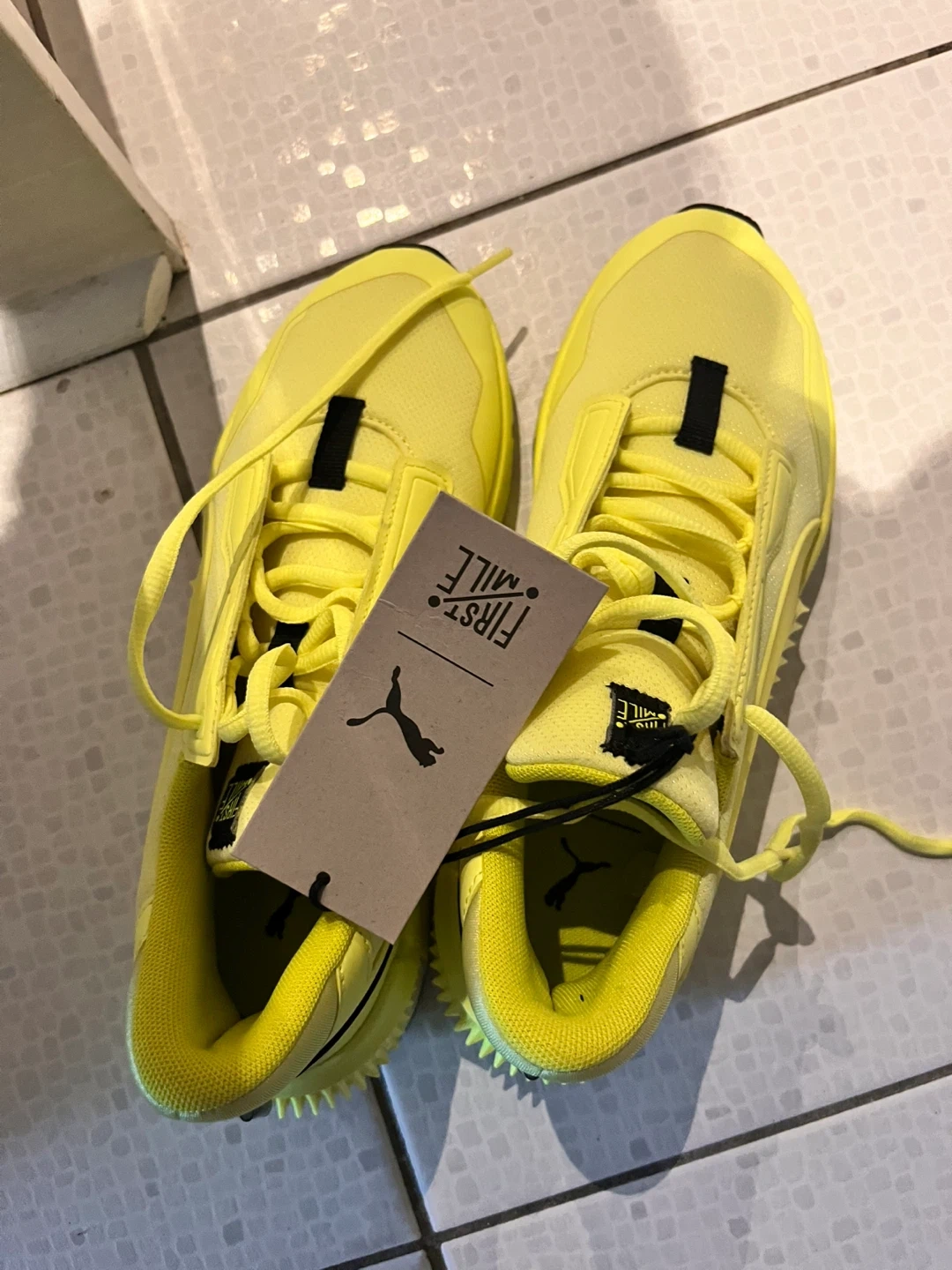 These Puma First Mile running shoes are in excellent condition and ready for your next run! The bright yellow colour will definitely make you stand out. They are lightweight and portable, perfect for taking on the go. Comes with the original box. Size 38/39