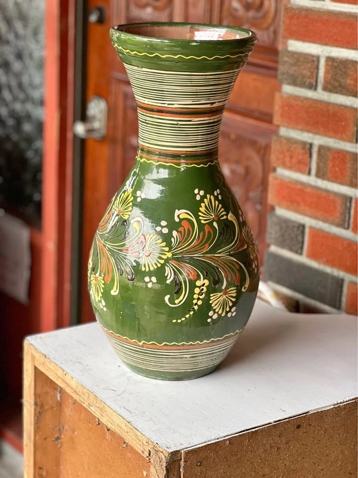 Vintage Lysa Gora (Bald Mountain) Polish pottery vase featuring traditional hand-painted folk art designs on a green glazed ceramic body. Handcrafted in Poland, likely from the Lysa Gora region known for its distinctive pottery. Features a vibrant green base glaze with intricate floral and linear patterns in yellow, white, red, and brown. The style is characteristic of Eastern European folk art ceramics, often referred to as Majolica. The vase is an original art pottery piece, valued for its unique, handcrafted nature. From a movie set sale. Pick up North Burnaby.