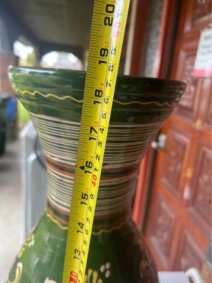 Vintage Lysa Gora (Bald Mountain) Polish pottery vase featuring traditional hand-painted folk art designs on a green glazed ceramic body. Handcrafted in Poland, likely from the Lysa Gora region known for its distinctive pottery. Features a vibrant green base glaze with intricate floral and linear patterns in yellow, white, red, and brown. The style is characteristic of Eastern European folk art ceramics, often referred to as Majolica. The vase is an original art pottery piece, valued for its unique, handcrafted nature. From a movie set sale. Pick up North Burnaby.