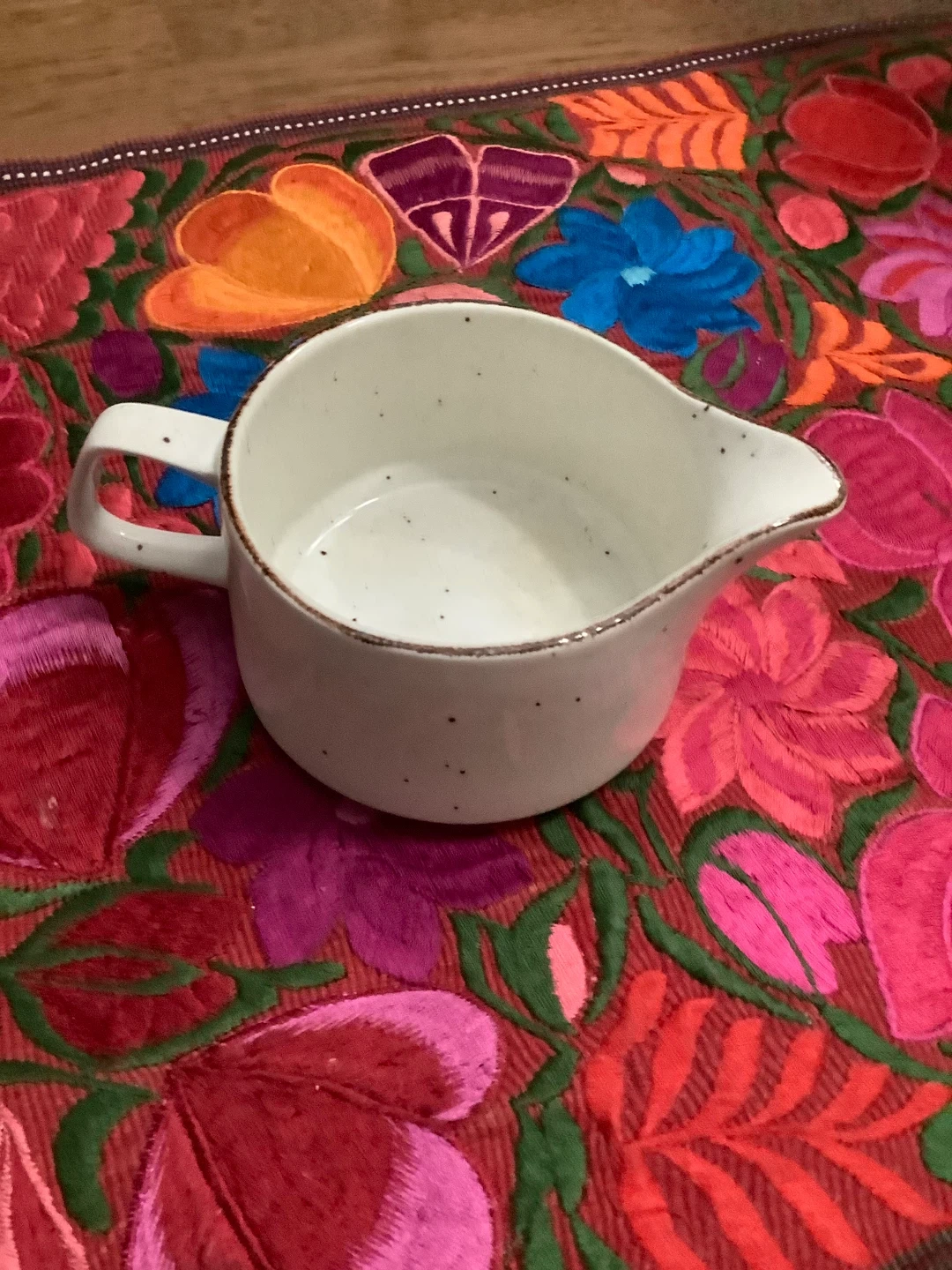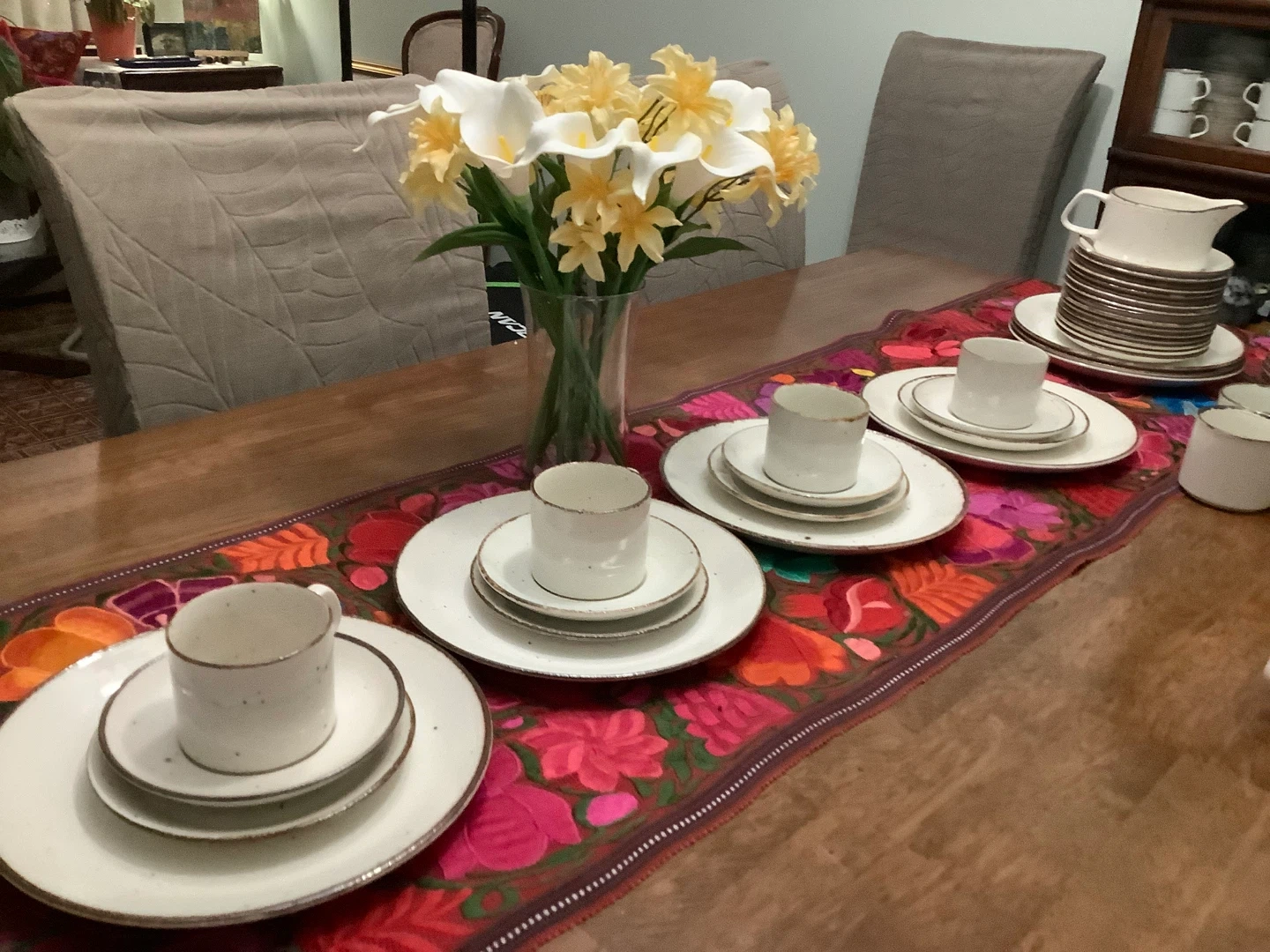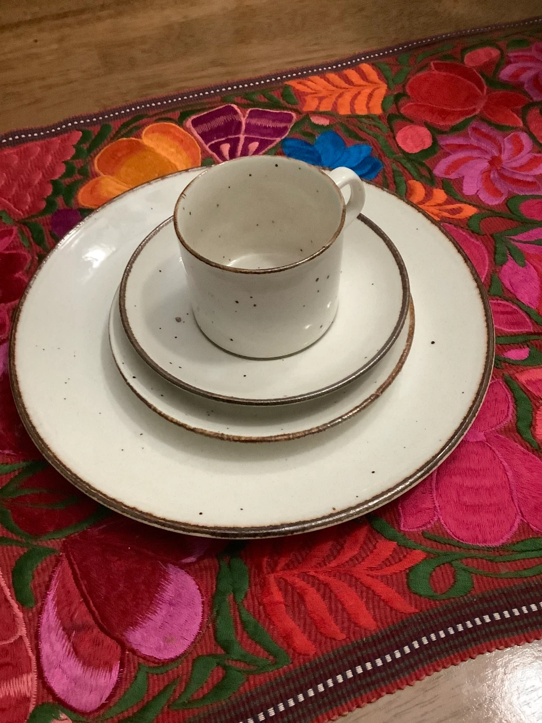 Cream ceramic place setting with subtle speckles and a brown rim. Includes one dinner plate, one salad plate, one saucer, and one cup. Dishwasher and microwave safe.