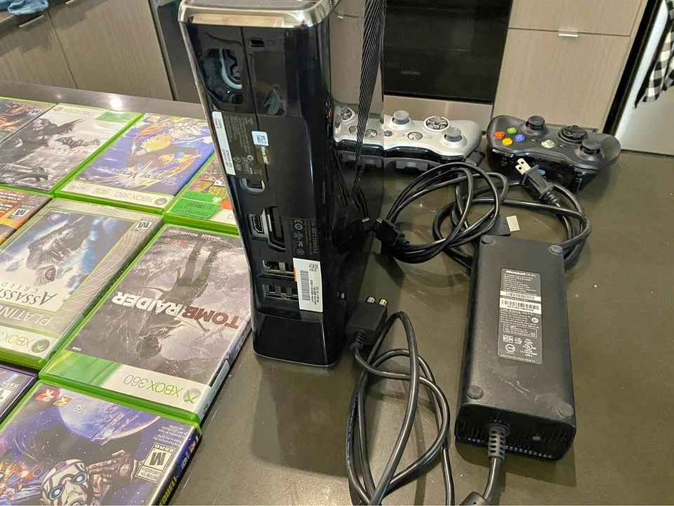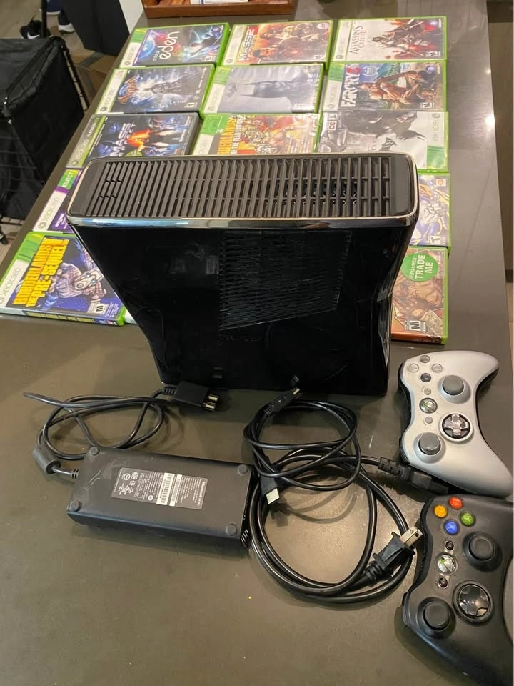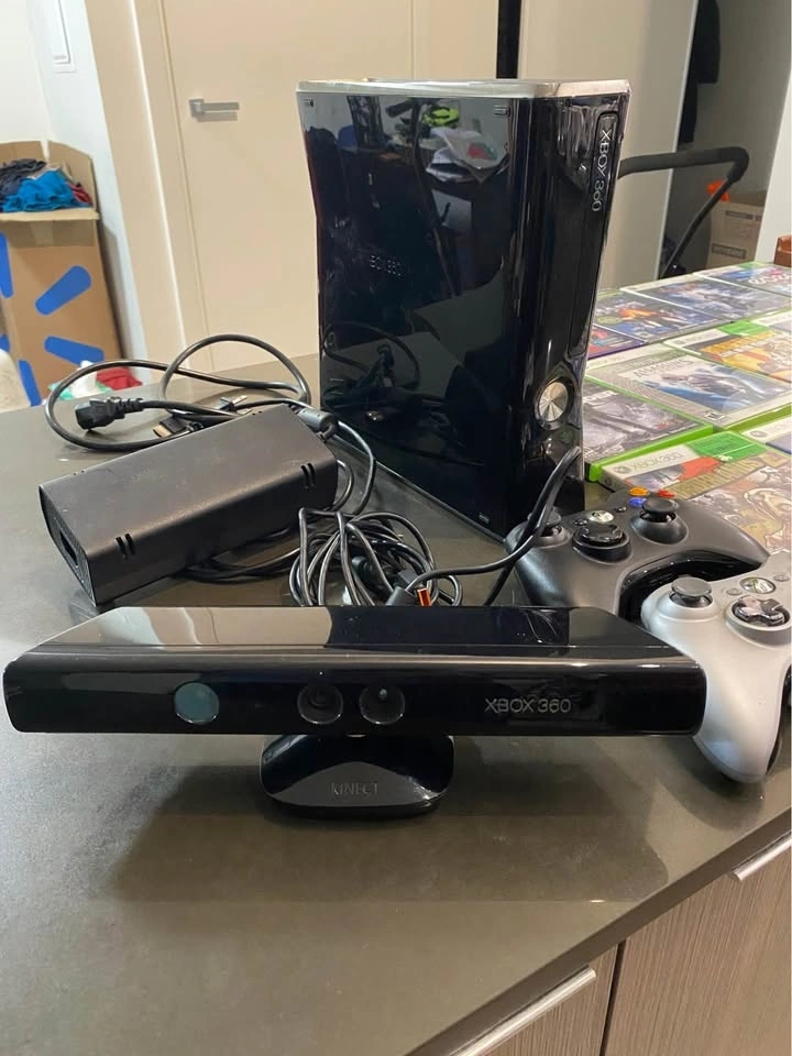 Black Xbox 360 console + Kinect with 2 controllers, power cord, and power adapter. Includes 15 Xbox 360 games. Everything is in good condition and works great.