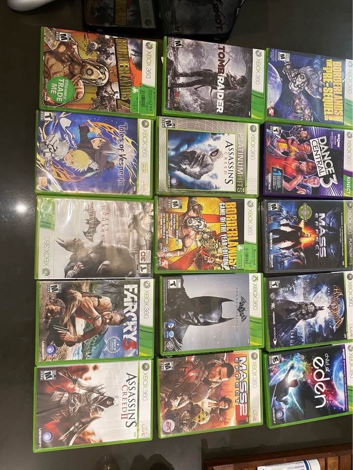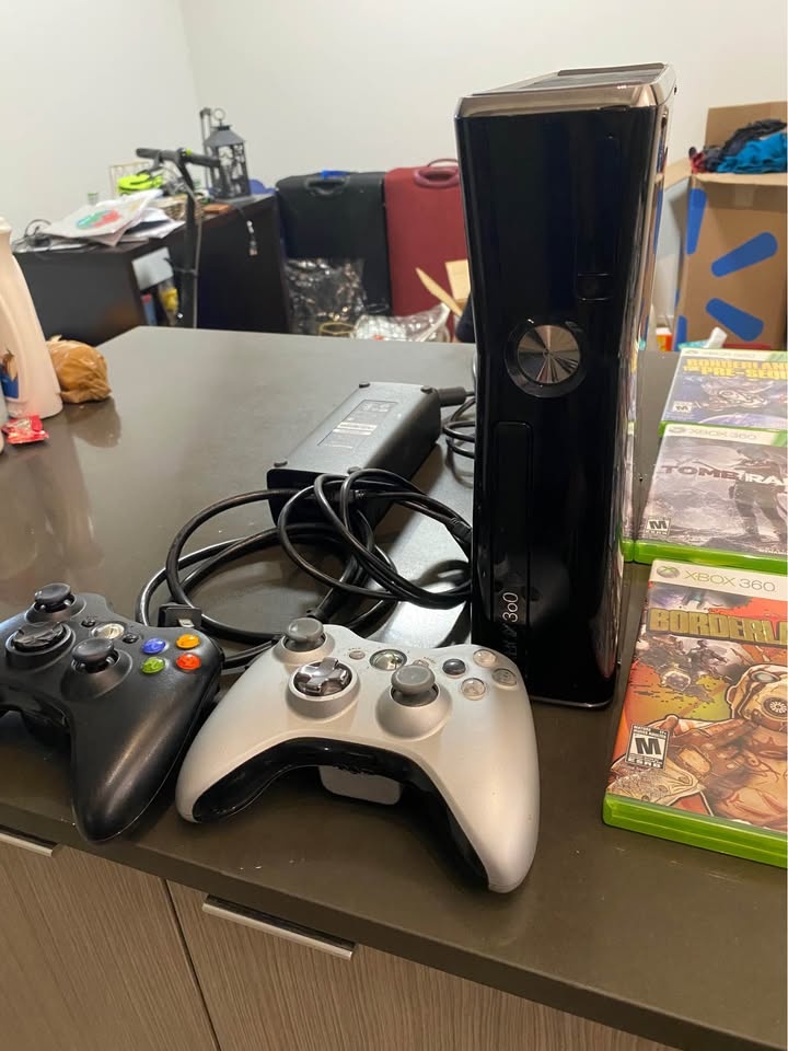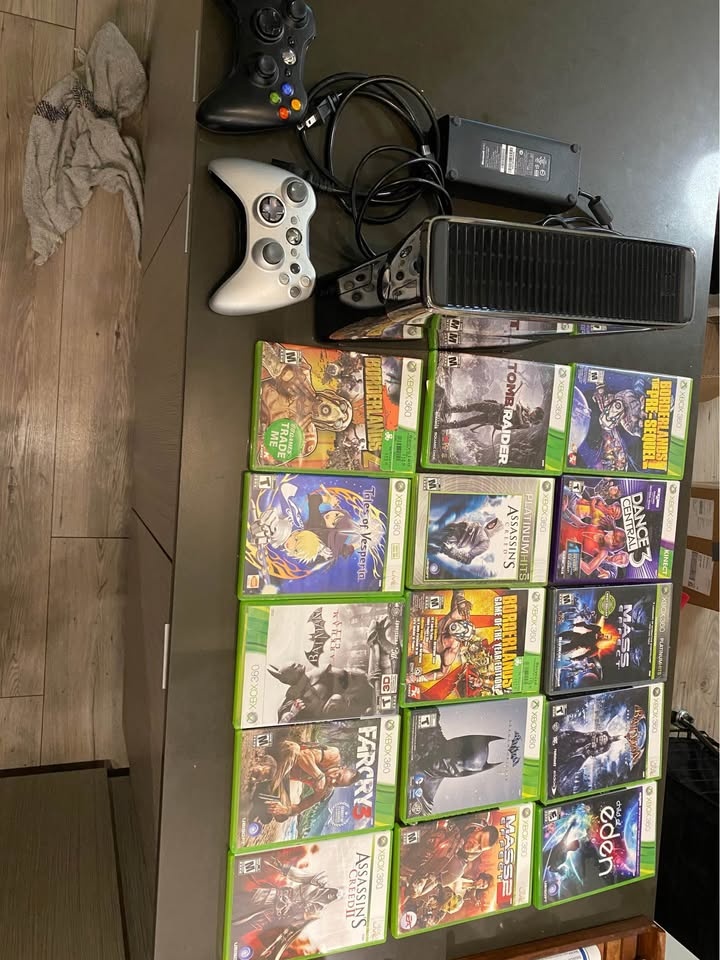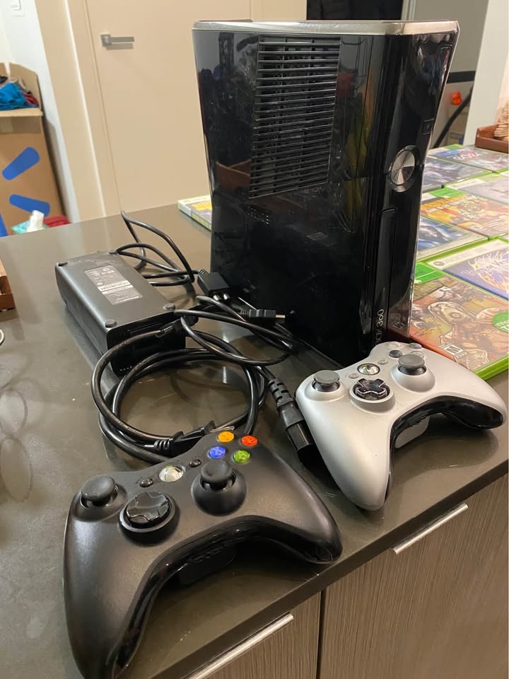 Black Xbox 360 console + Kinect with 2 controllers, power cord, and power adapter. Includes 15 Xbox 360 games. Everything is in good condition and works great.