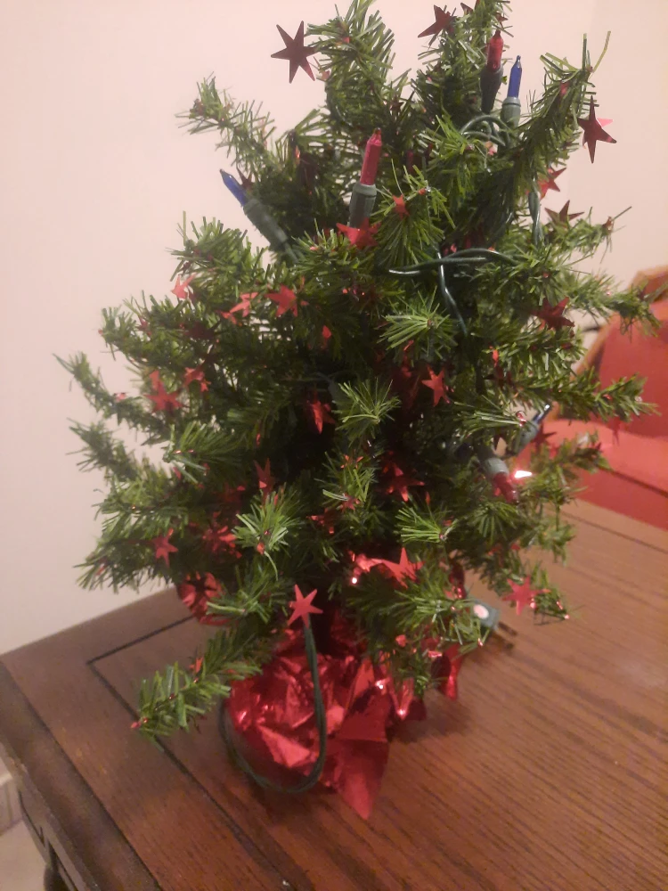 Here's a small Table/Desk-top Christmas tree, all decorated and ready to go! It's perfect for adding a bit of festive cheer to a small space, like an apartment or office. It's in great condition and comes with the lights and sparkles already on it. From a Clean Pet Free & Smoke Free Home DM for Pickup Near Steeles Ave W & Mavis Rd Moving Sale...I have other items to browse. Some Great Gift Ideas! Come create a bundle and let's make a deal! Thank-you for Checking.