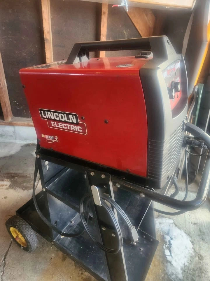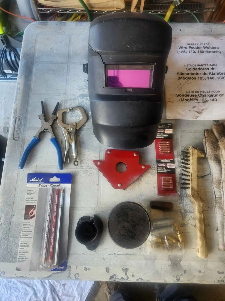 Comes with everything shown in the pictures, including the gas cylinder with gauges. If the ad is still up, it's available. Capable of welding 24-gauge up to 5/16 inch materials. Suitable for MIG and Flux-Cored welding. Includes a welding gun, ground clamp, gas regulator, hose, and sample spools. Duty cycle: 20% at 90A. Wire feed speed: 50-500 inches per minute.
