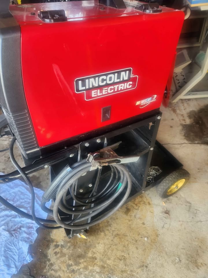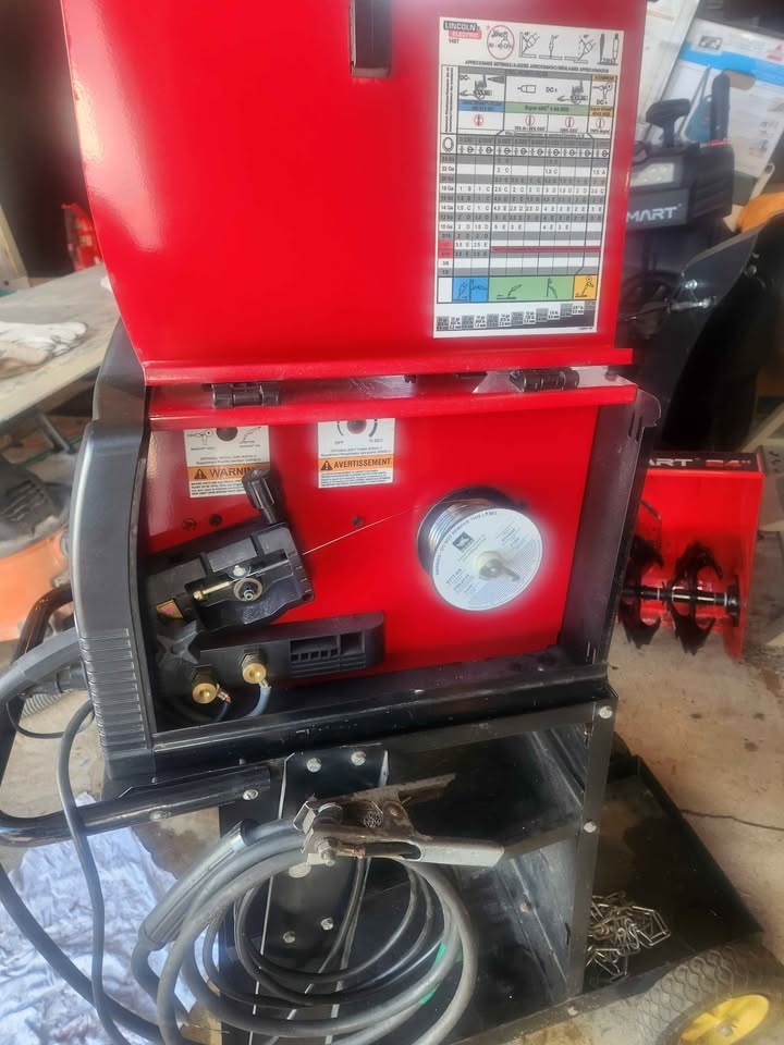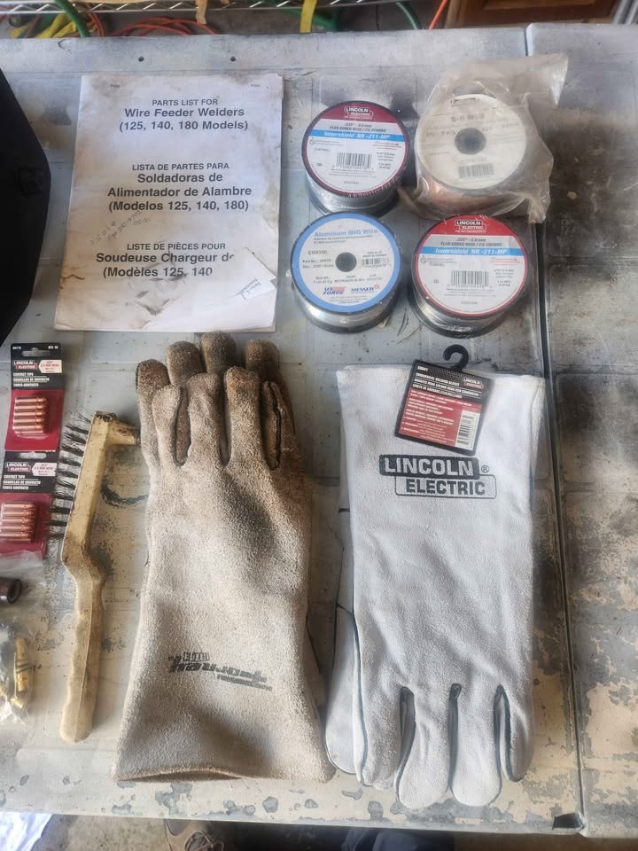 Comes with everything shown in the pictures, including the gas cylinder with gauges. If the ad is still up, it's available. Capable of welding 24-gauge up to 5/16 inch materials. Suitable for MIG and Flux-Cored welding. Includes a welding gun, ground clamp, gas regulator, hose, and sample spools. Duty cycle: 20% at 90A. Wire feed speed: 50-500 inches per minute.