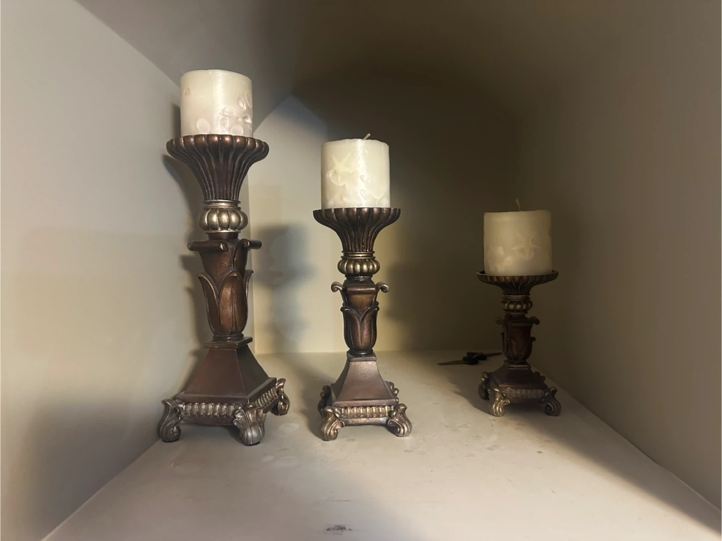 This is a set of three ornate candle holders in a bronze finish. They're designed with intricate detailing, perfect for adding a touch of elegance to your space. The candle holders are made from a durable metal.