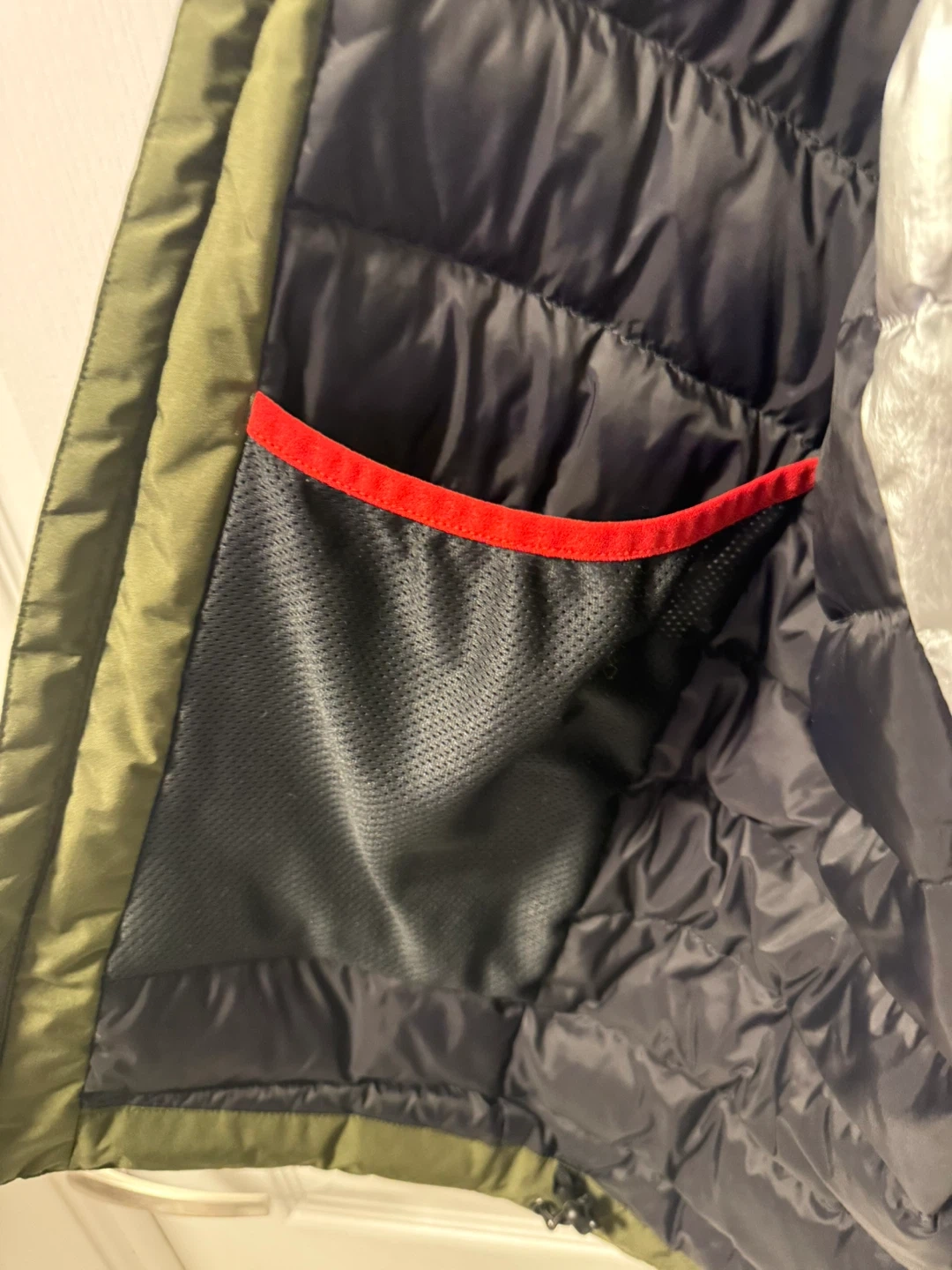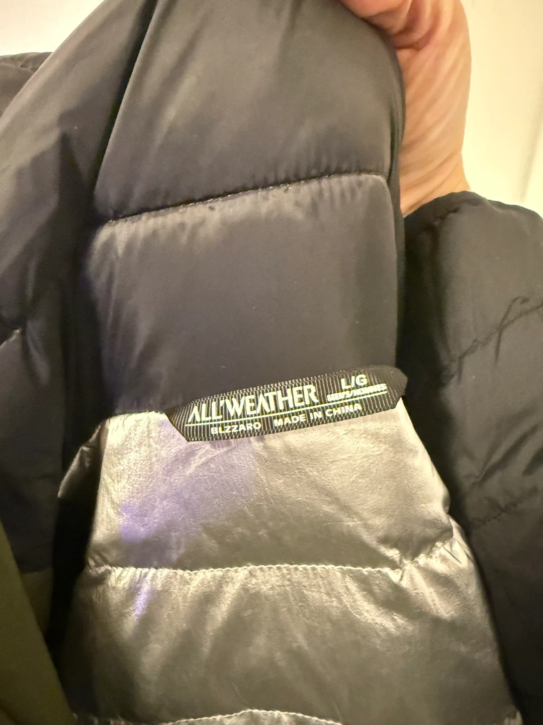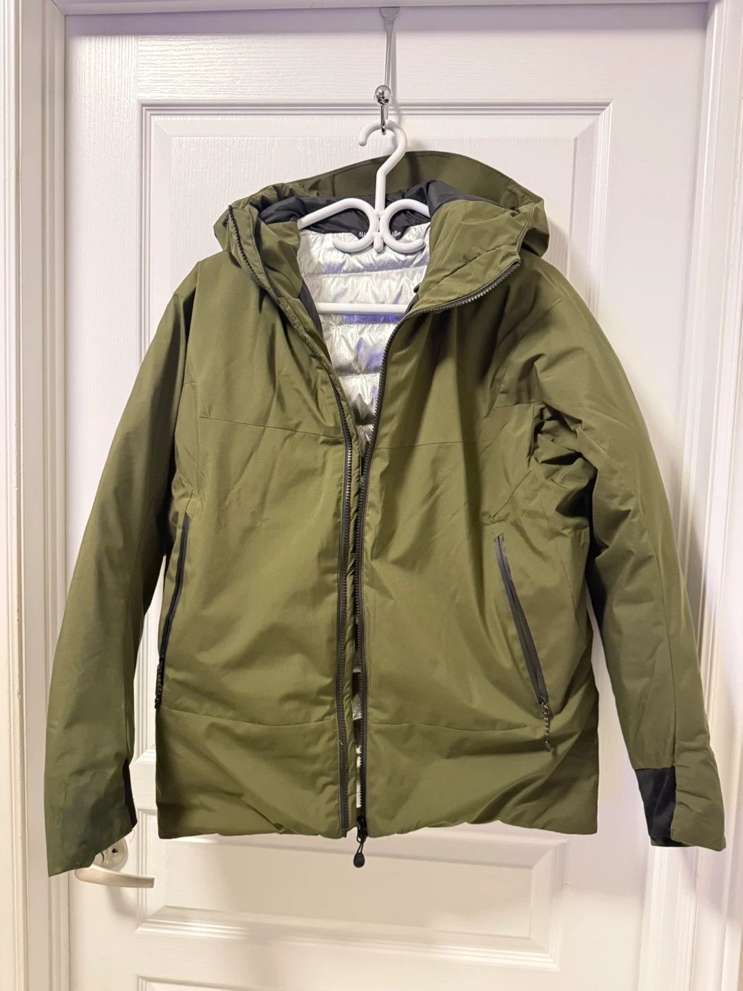 This All Weather jacket is olive green. It's made with 100% nylon fabric and 100% polyester lining. The filler is 90% duck down and 10% feathers. This jacket would be useful for keeping warm in cooler weather.