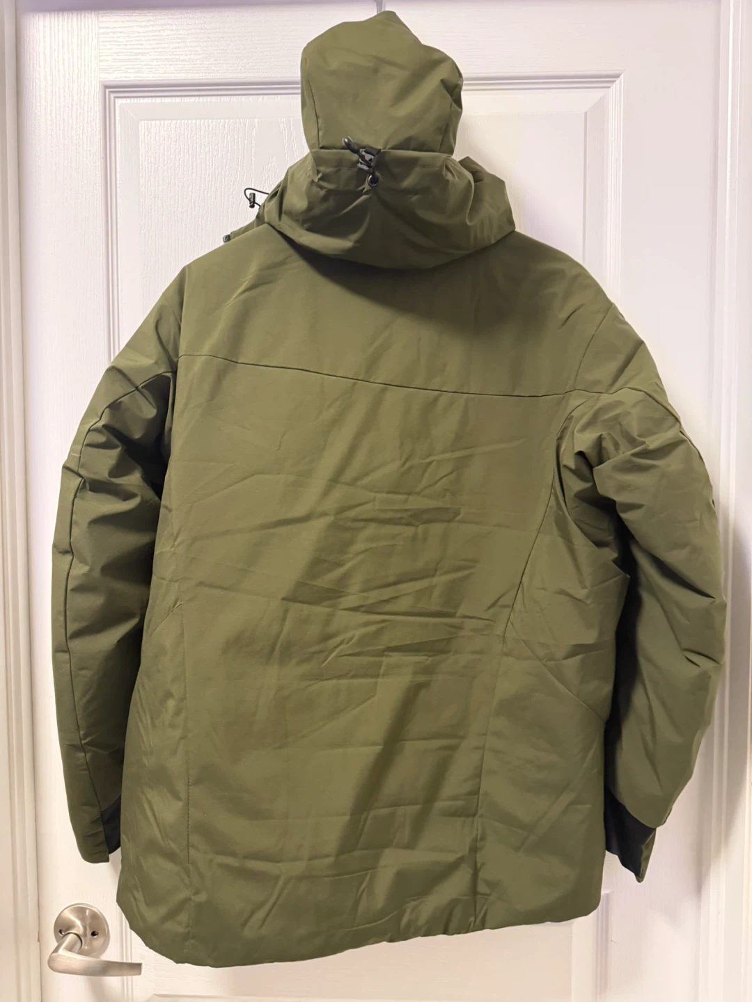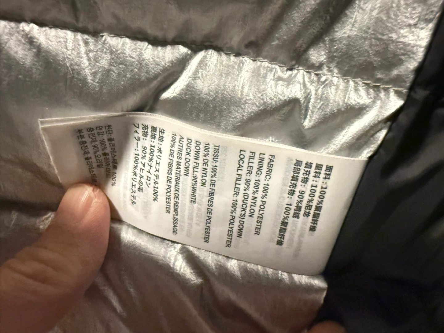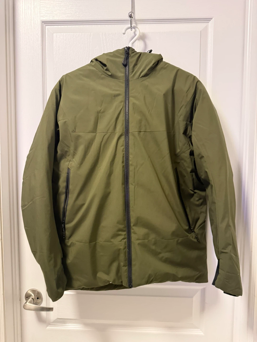 This All Weather jacket is olive green. It's made with 100% nylon fabric and 100% polyester lining. The filler is 90% duck down and 10% feathers. This jacket would be useful for keeping warm in cooler weather.