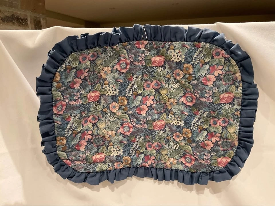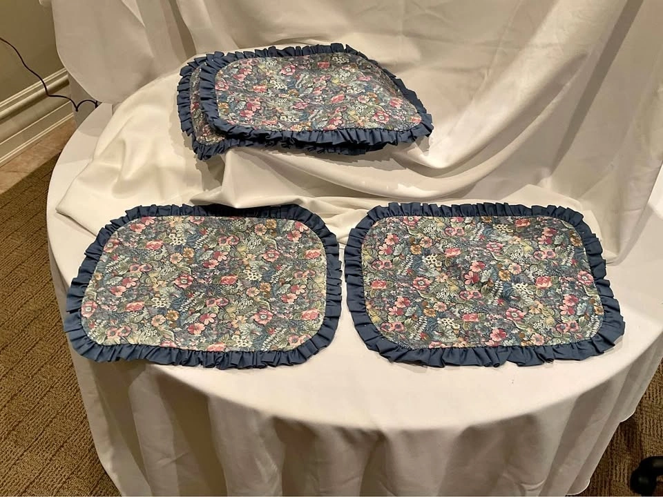 Pretty set of 4 placemats with a lovely multi-color floral pattern in blue, pink, and green tones on a dark blue background. Each placemat has a dark blue ruffled border. Size 18" x 13 1/2". Washed & Pressed. Smoke & Pet Free Home. Located Richmond Hill / Bathurst & King Rd.