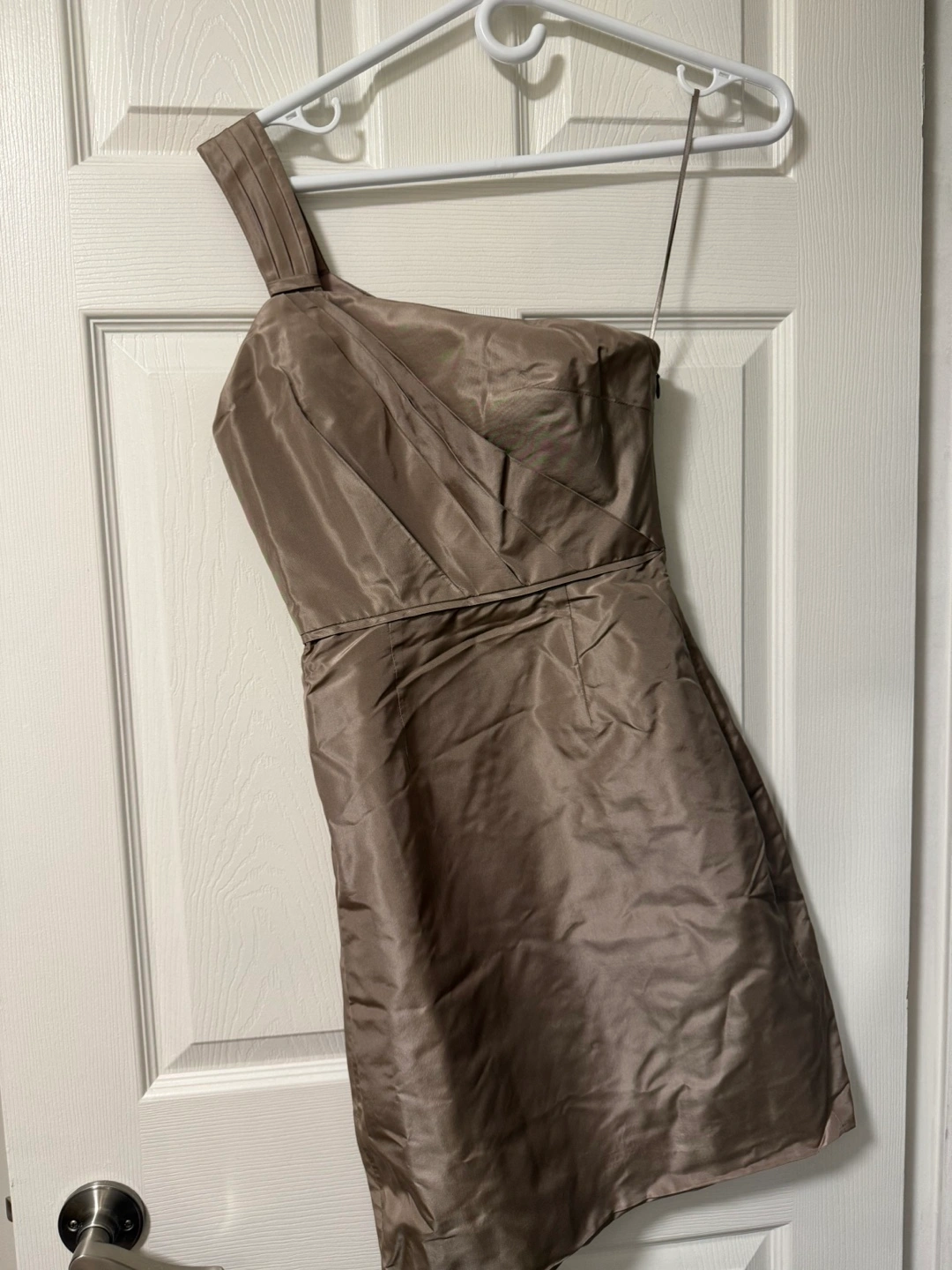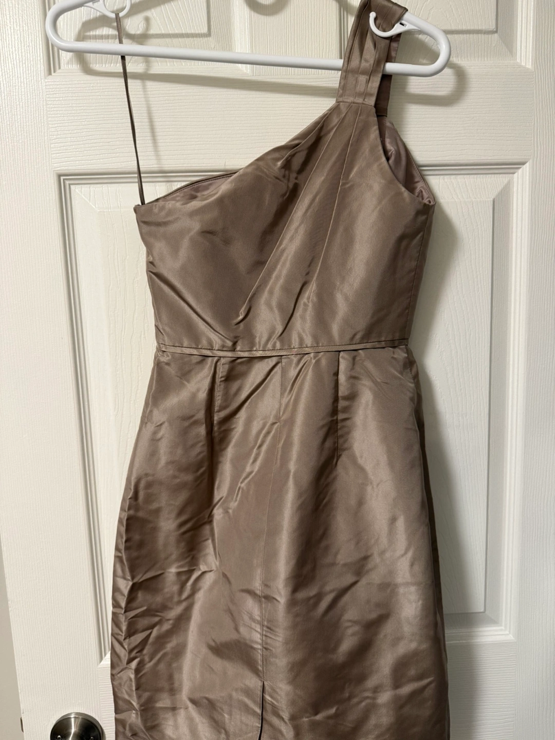 Gorgeous taupe one-shoulder dress. Petite size 00. Silky material. Simple and elegant.
