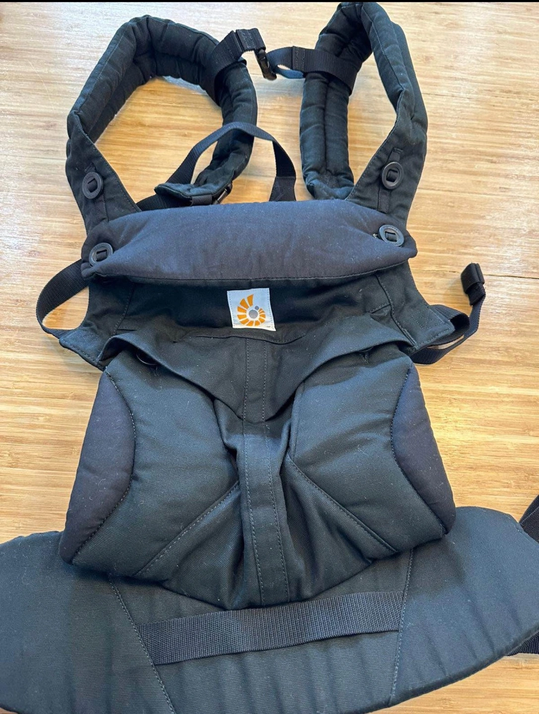 Black baby carrier. Adjustable straps. Padded shoulder straps and hip belt. Good for newborns and older babies.