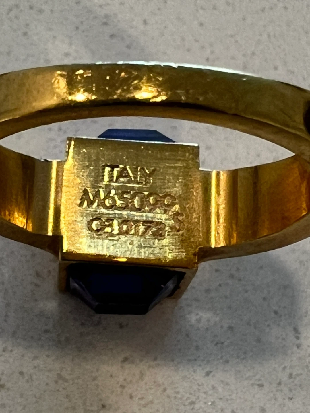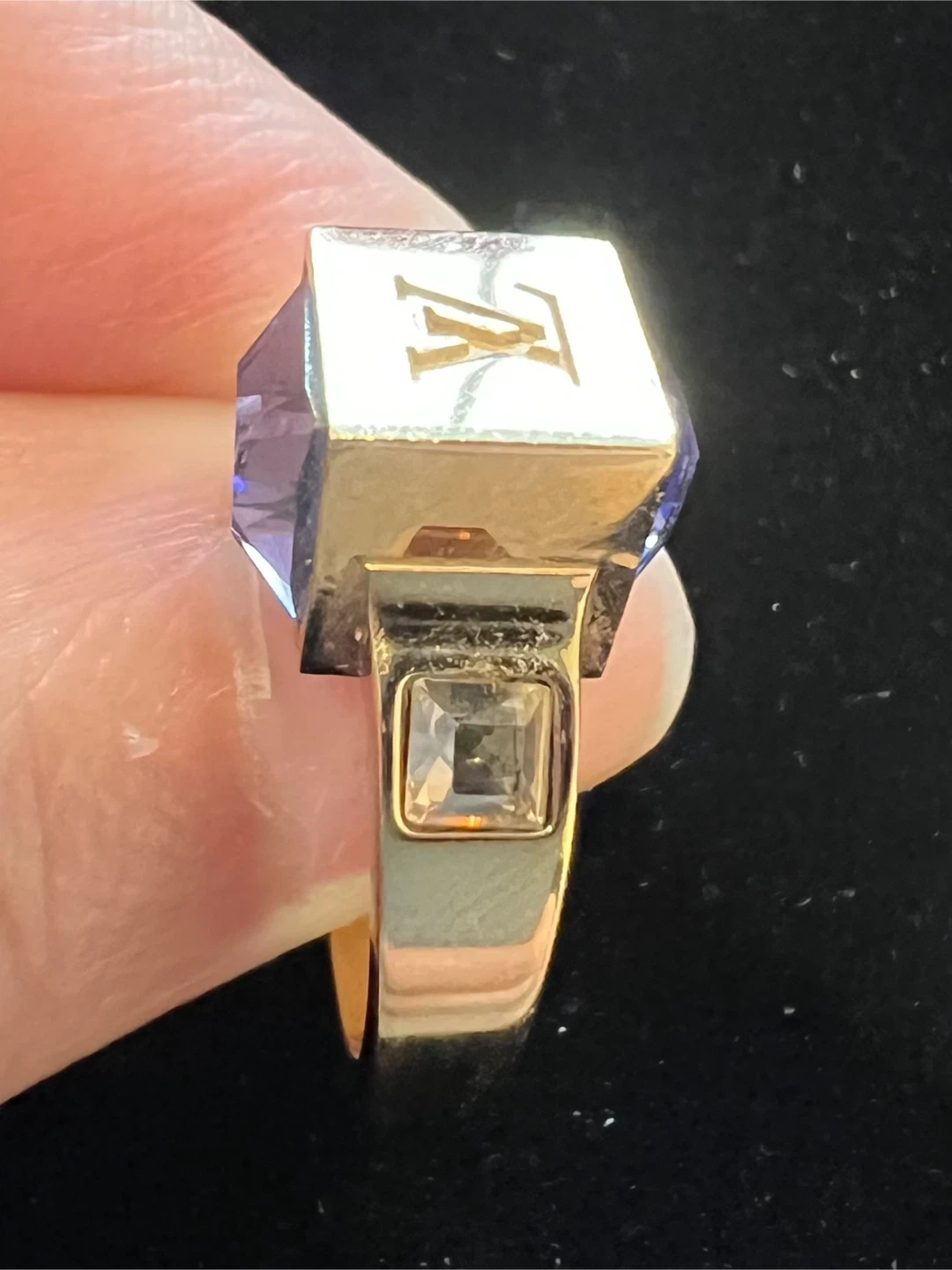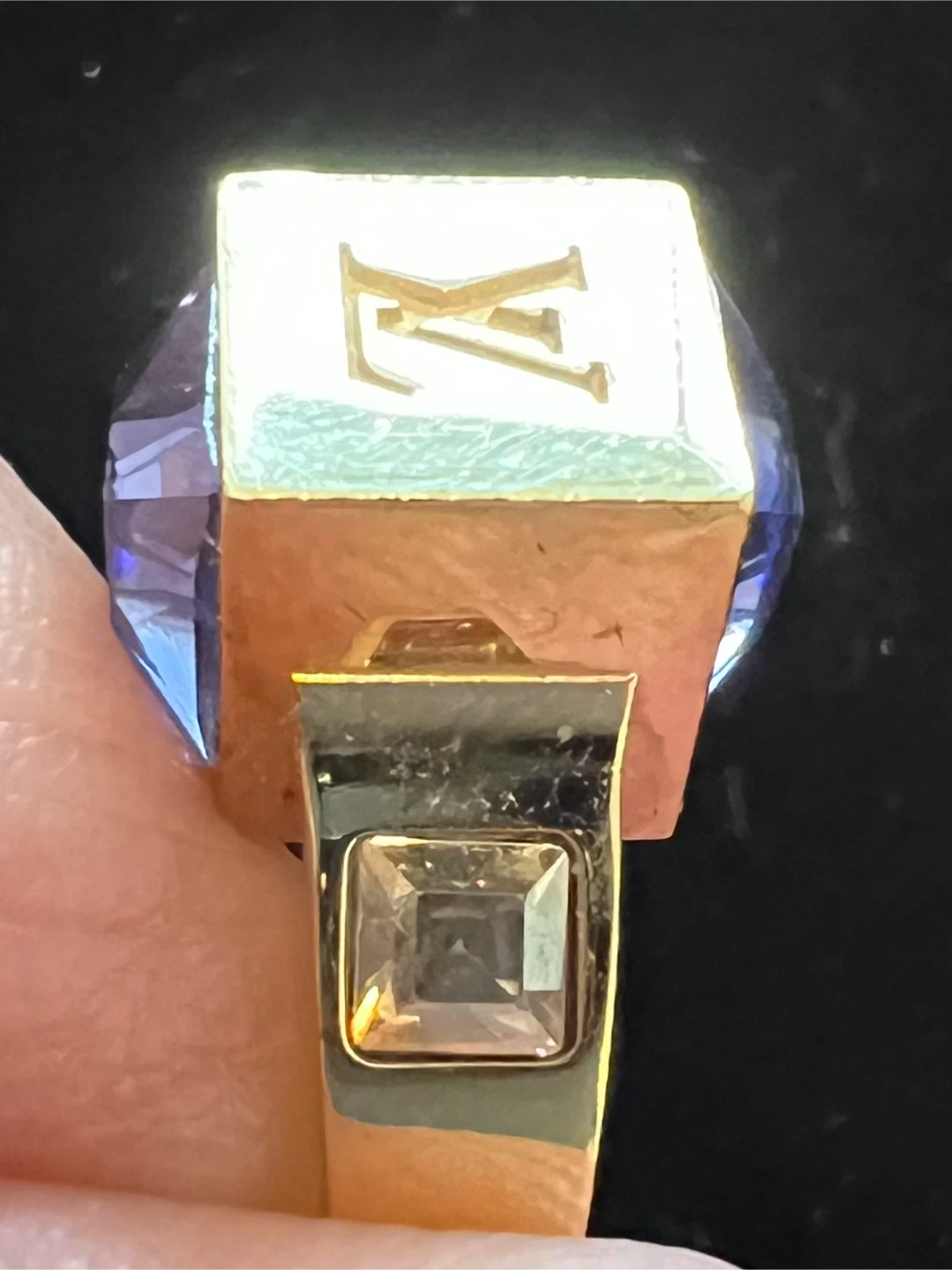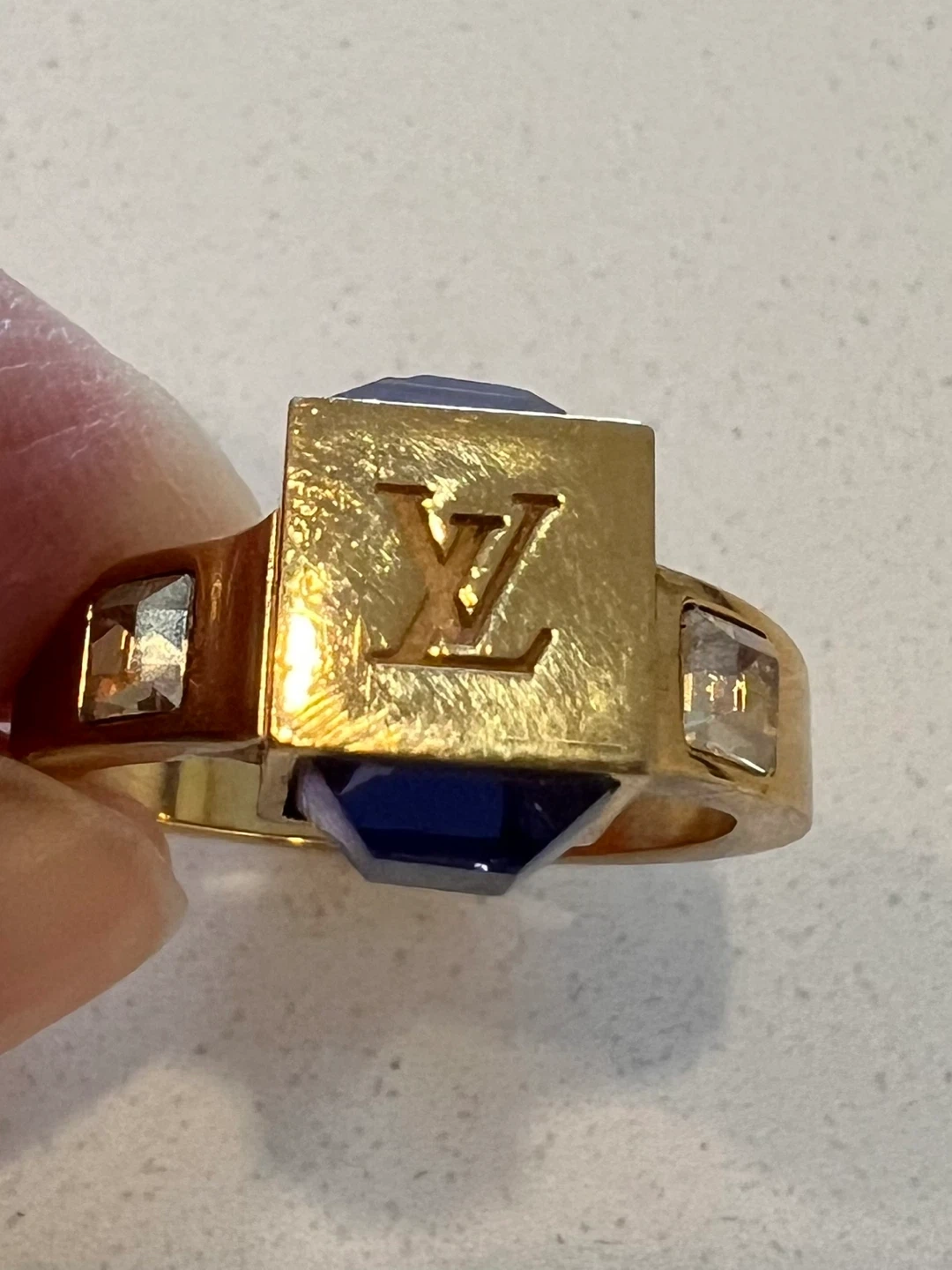 This ring features a prominent blue stone and the iconic LV logo. It's crafted in Italy and has additional smaller stones on the sides. The band is gold-toned.