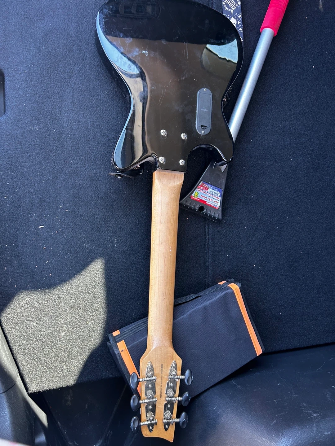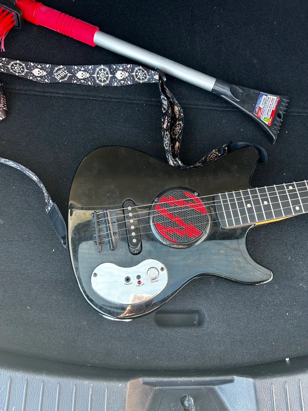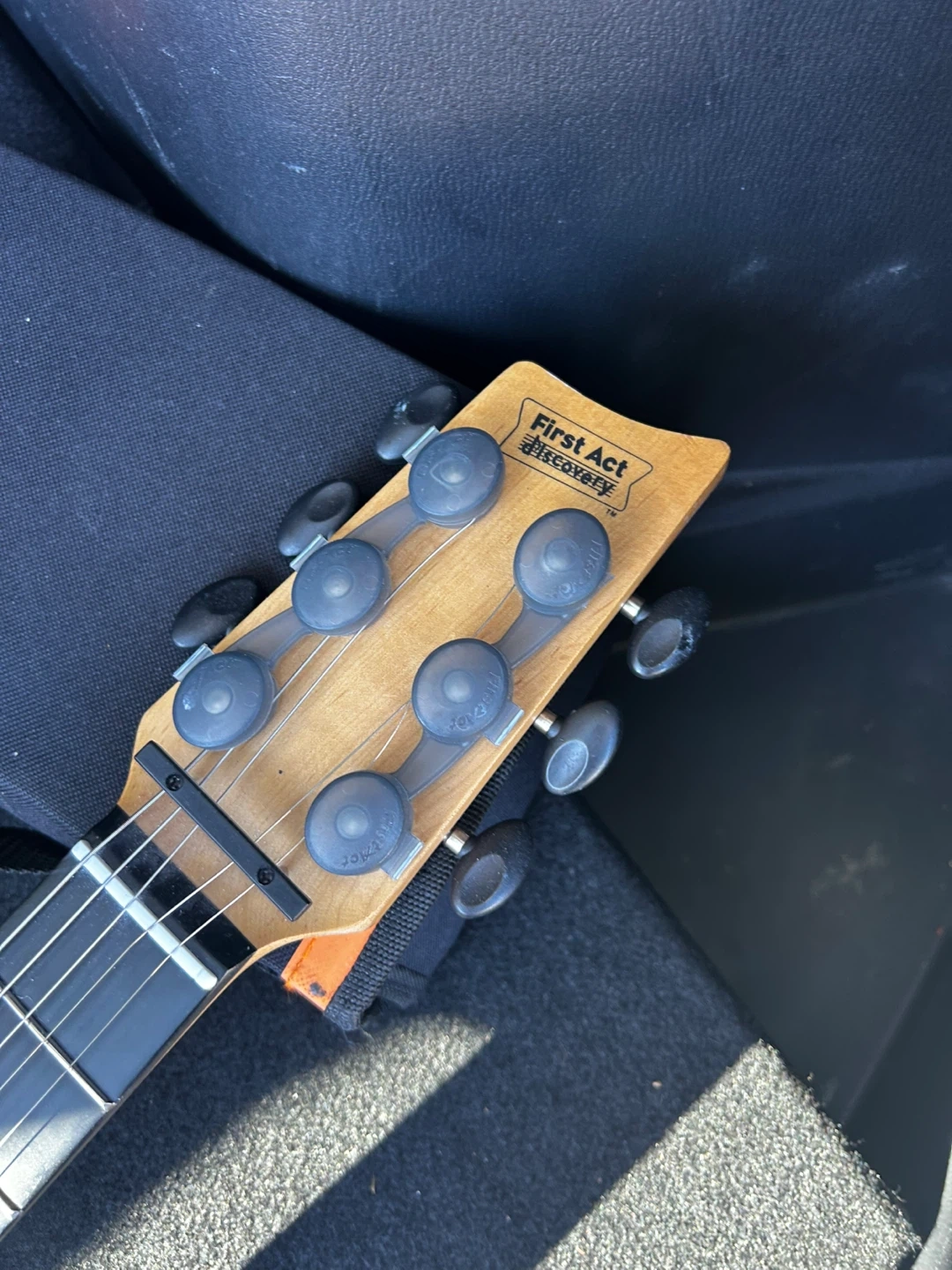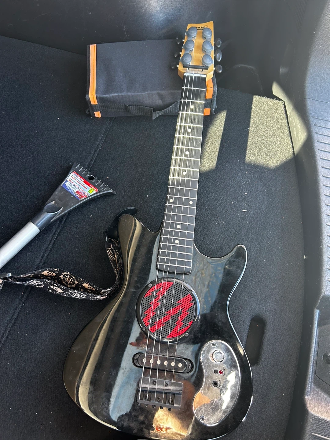 A black First Act Discovery electric guitar. It's a fun beginner instrument for aspiring musicians. Comes with a gig bag for easy transport.
