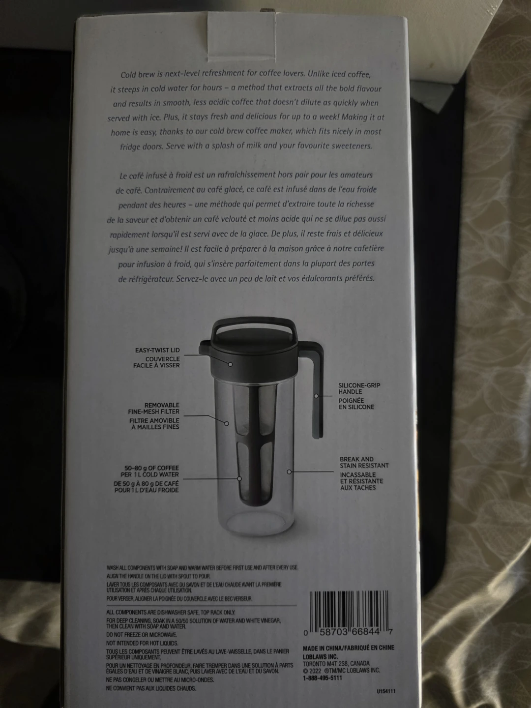 The product in the image is the President's Choice (PC) Cold Brew Coffee Maker.