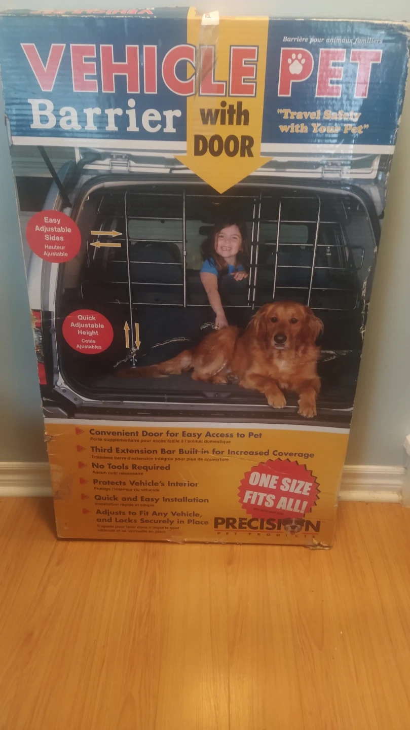 This Precision Pet vehicle barrier comes with a door for easy pet access. It's designed to protect your vehicle's interior and provide increased coverage. One size fits all and it adjusts to fit any vehicle securely. Quick and easy installation, no tools required!