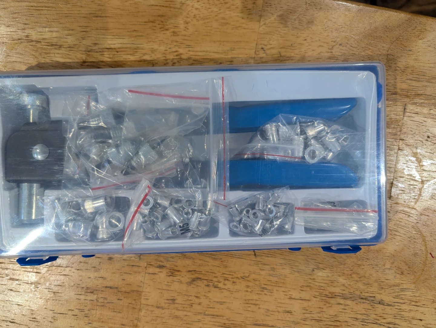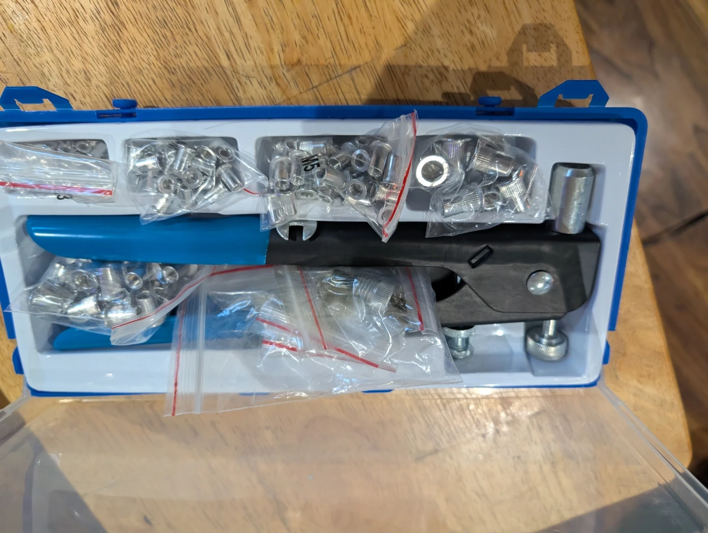 This is a rivet nut tool kit for fastening. It includes a rivet nut tool and several sizes of assorted rivet nuts. All pieces come in a blue carrying case.