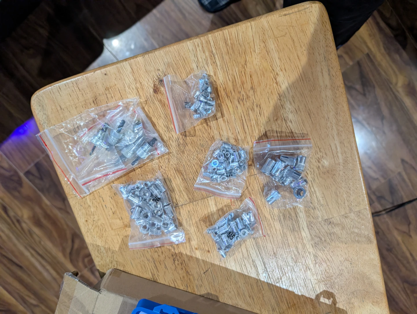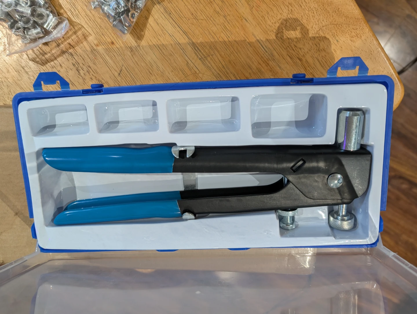 This is a rivet nut tool kit for fastening. It includes a rivet nut tool and several sizes of assorted rivet nuts. All pieces come in a blue carrying case.