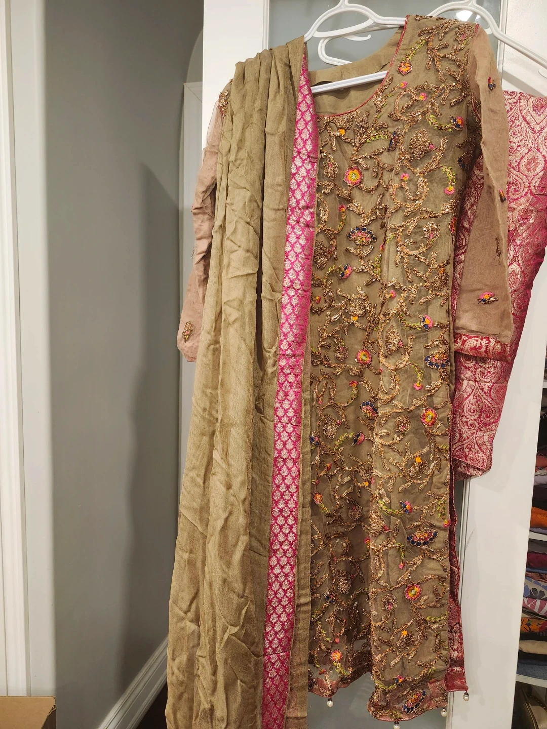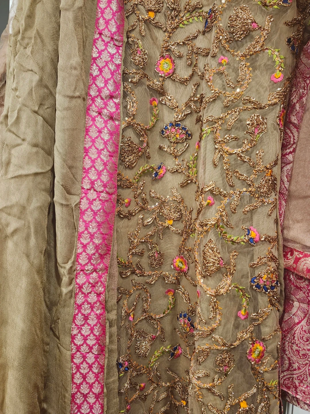 Three-piece outfit with intricate gold and colourful embroidery. Includes a kameez, salwar, and matching dupatta. Fabric appears to be a sheer net with silk or satin lining in parts. Perfect for cultural events or formal occasions.