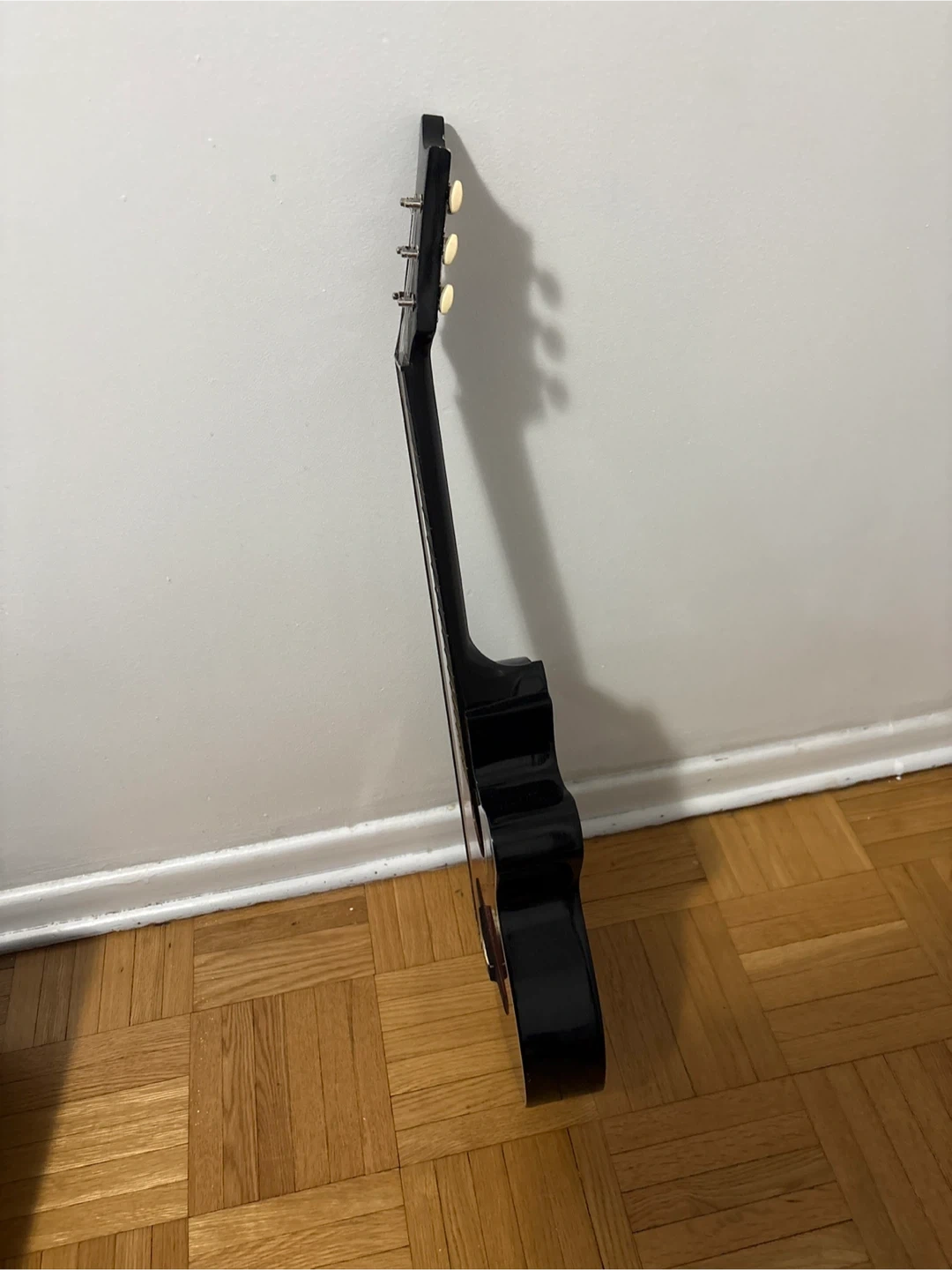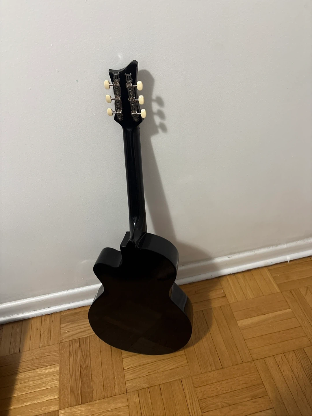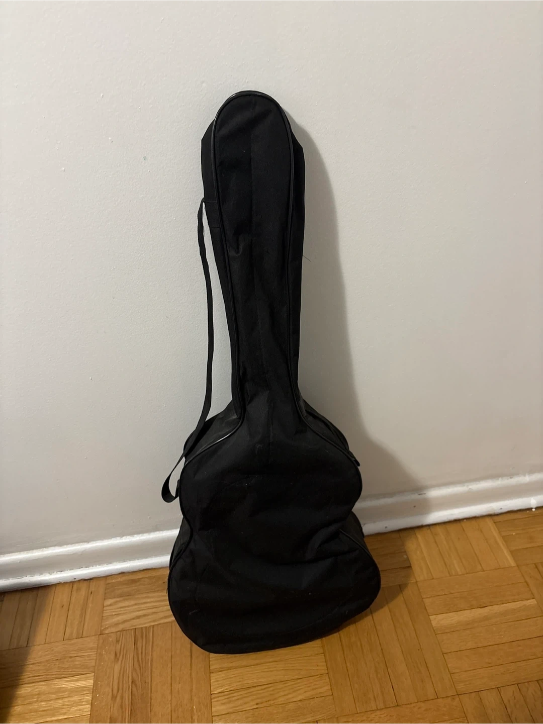 This is a black acoustic guitar. It comes with a gig bag and two sets of Cuatro strings. It's ready for some music!