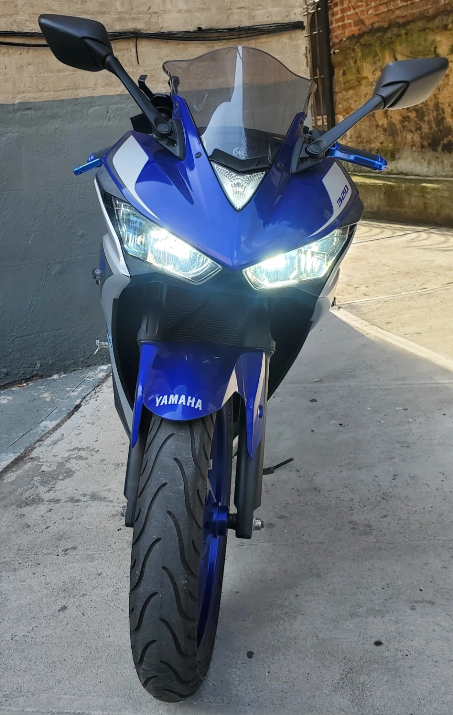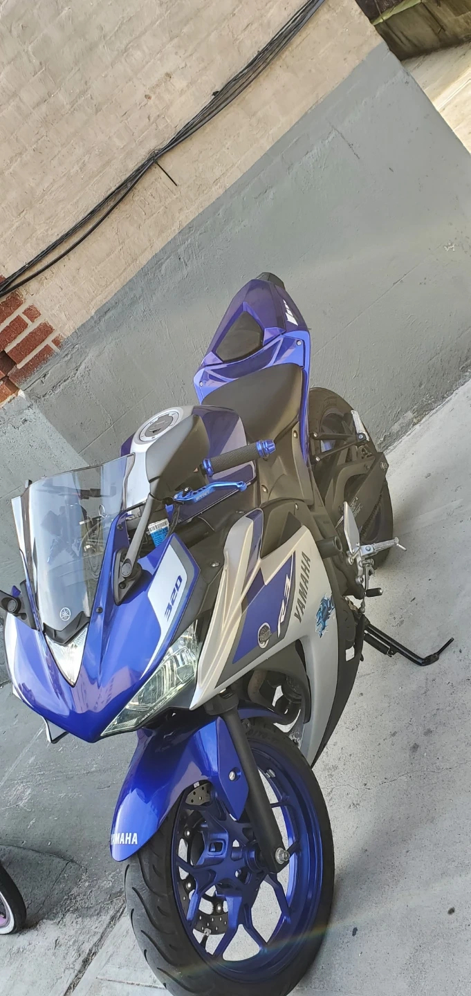 Yamaha R3 sportbike in a striking blue and silver color scheme. It features a sleek design and a 320cc engine. Perfect for riders looking for a nimble and responsive machine!