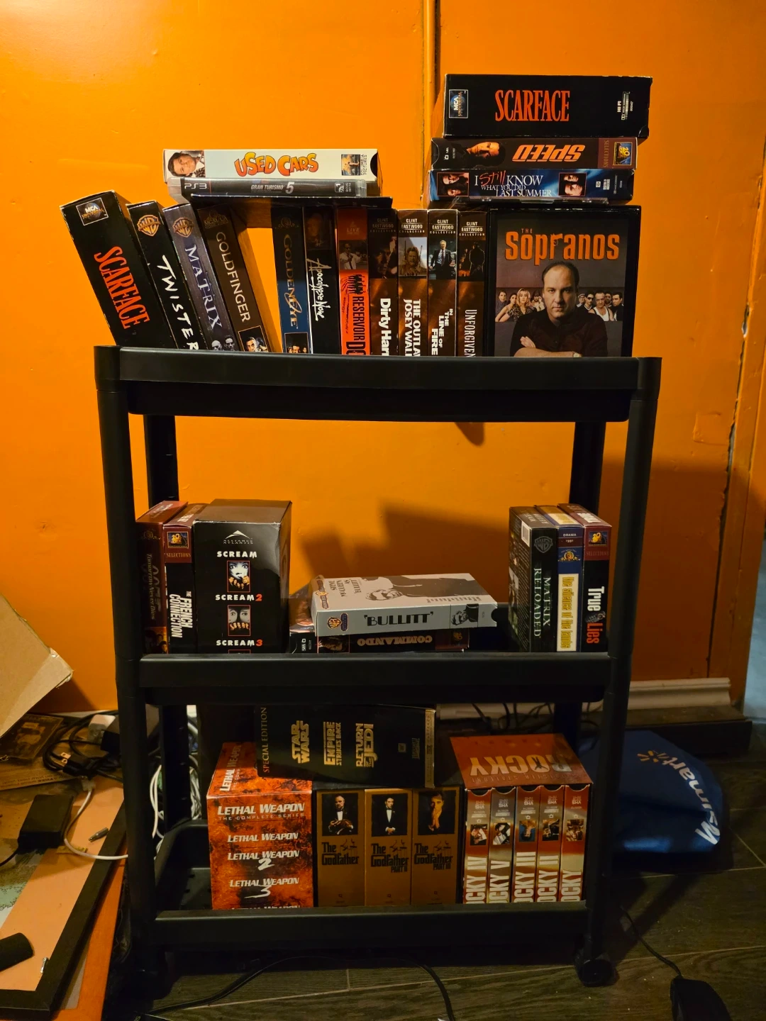 Selling a collection of VHS tapes including classics like Scarface, The Sopranos, Rocky, and The Godfather. A blast from the past for any movie buff!