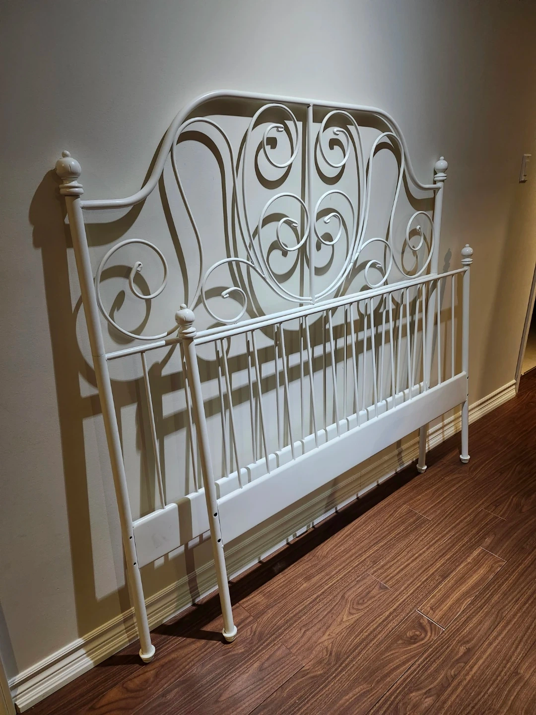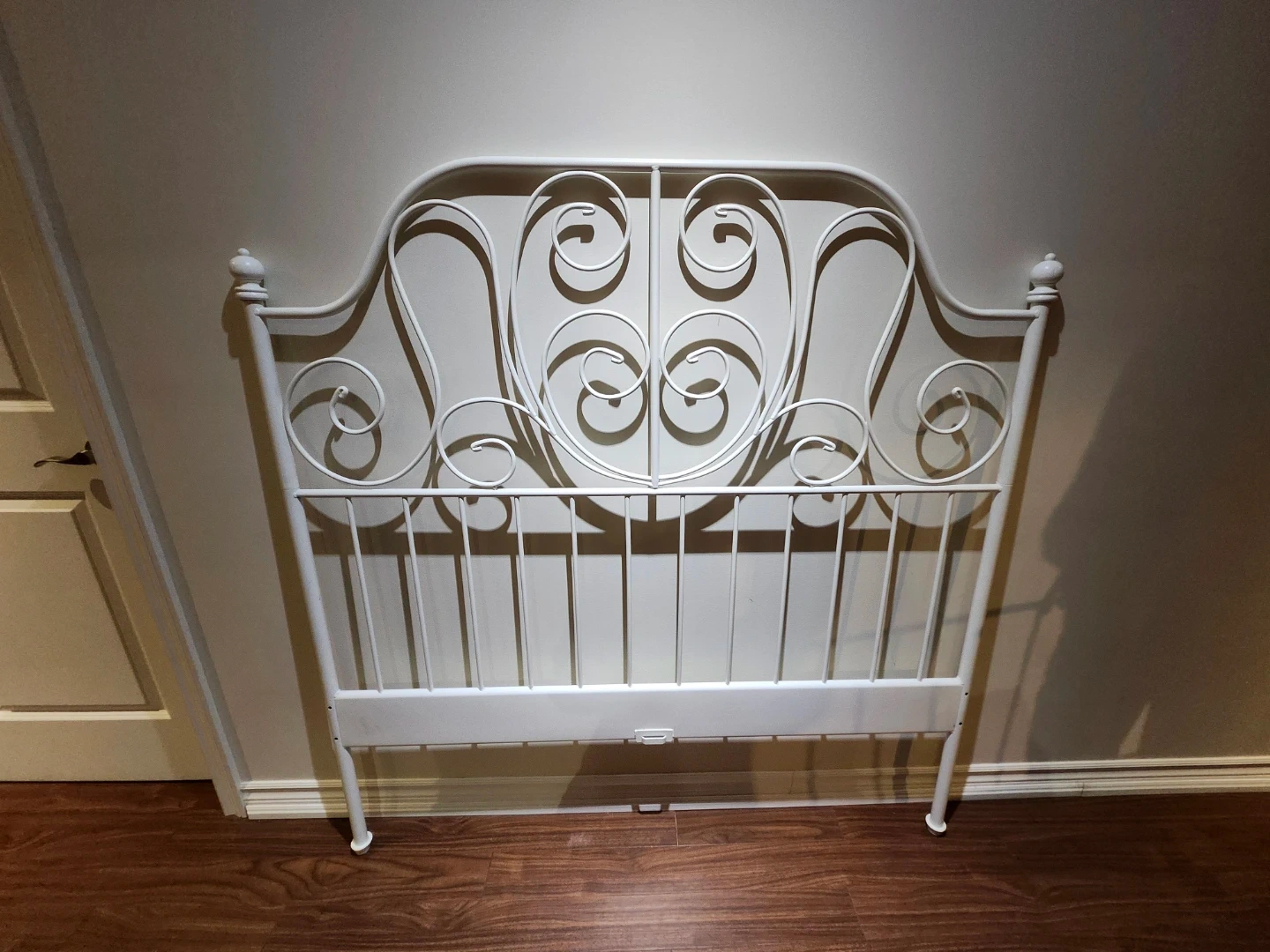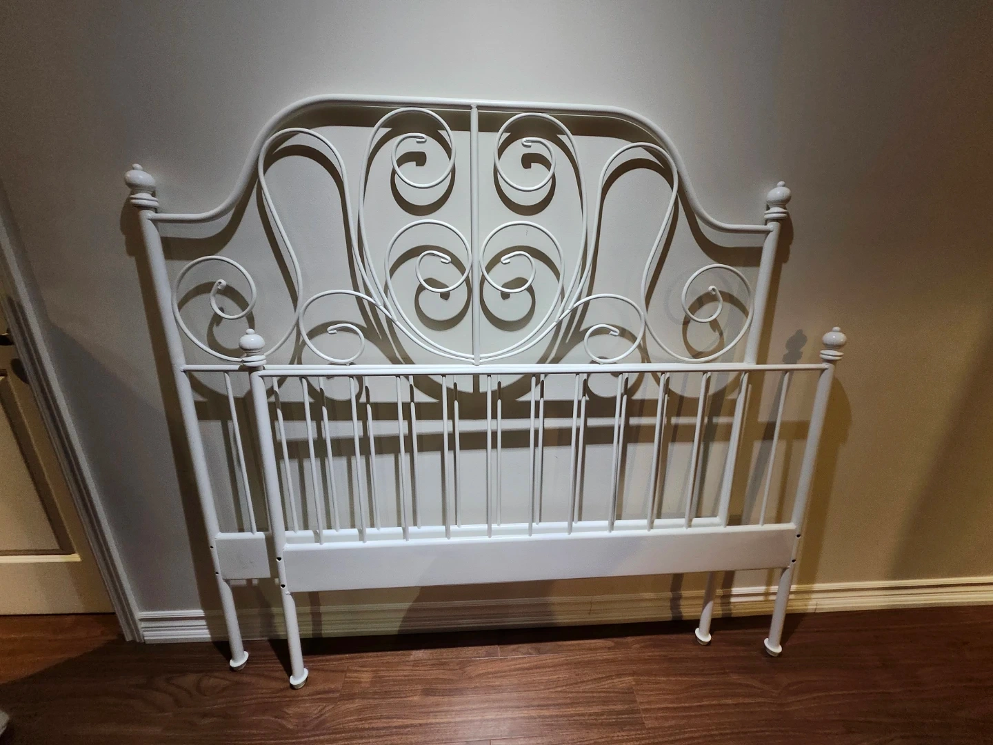 This is an IKEA LEIRVIK metal bed frame in white. It's a double size, featuring a decorative design in the head and footboard. This frame would be great for a bedroom looking for a classic, elegant touch.