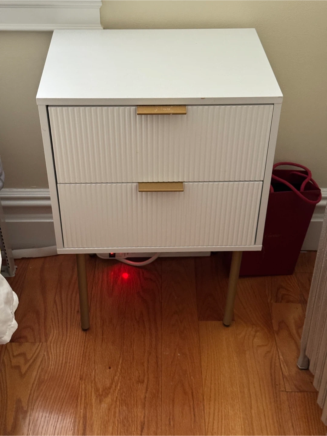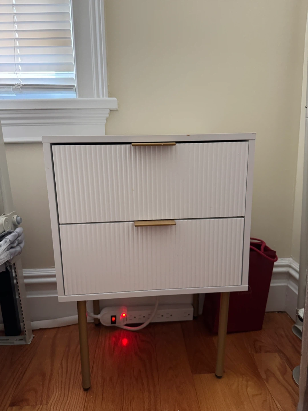White two-drawer nightstand with a ribbed front design and gold pull handles. It's supported by slender gold legs for a modern look. This nightstand offers convenient bedside storage. I have two available. 30 each.