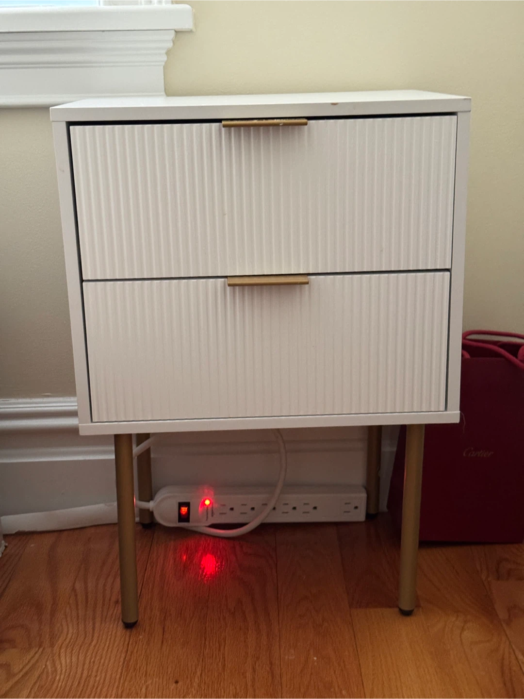 White two-drawer nightstand with a ribbed front design and gold pull handles. It's supported by slender gold legs for a modern look. This nightstand offers convenient bedside storage. I have two available. 30 each.