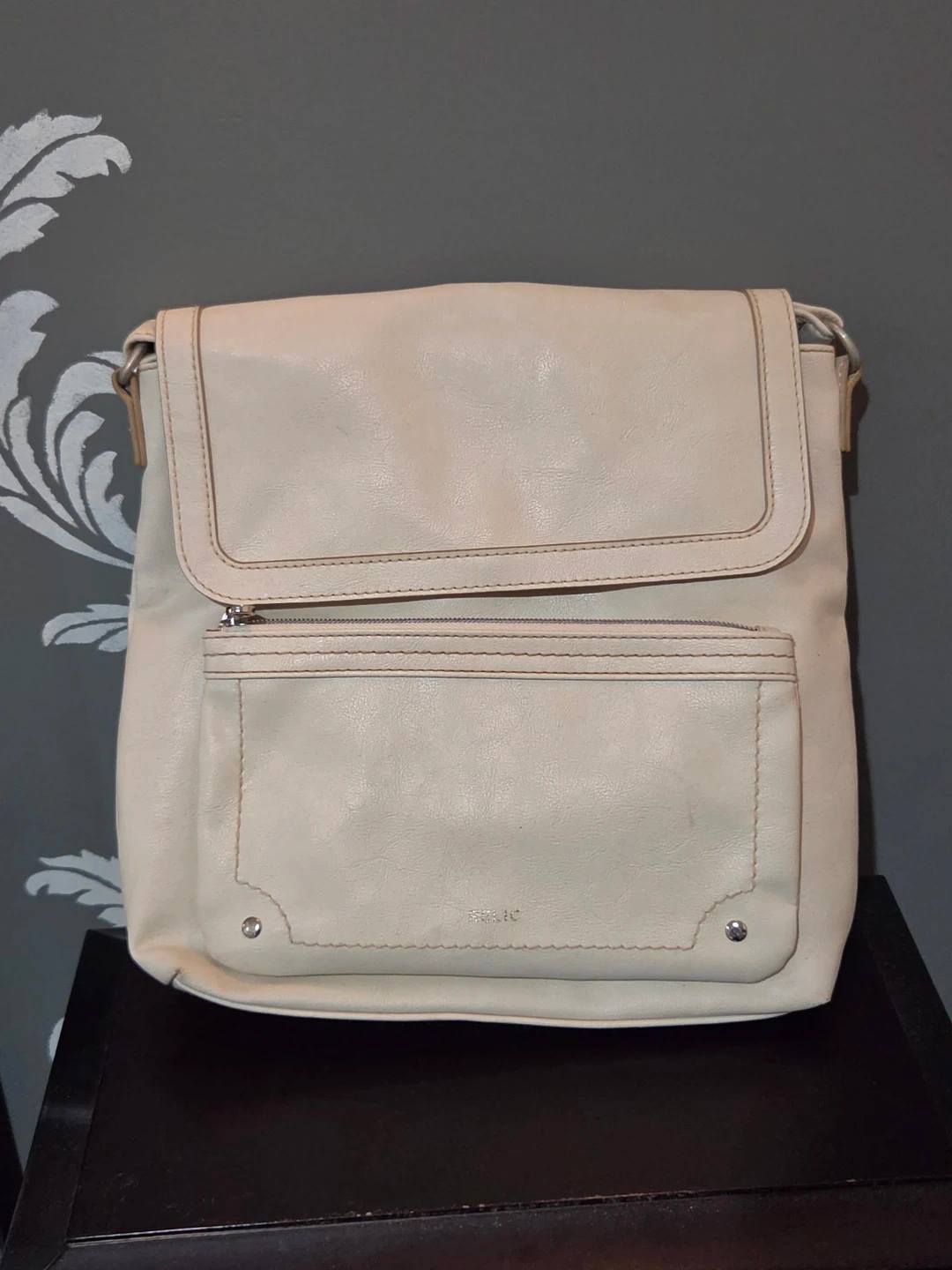 Brand new cream shoulder bag by Relic, made of durable faux leather. Features a stylish flap closure with a convenient front zip pocket.