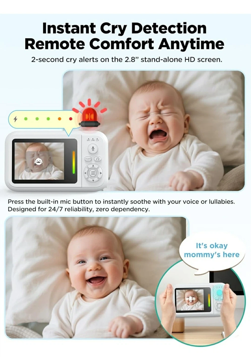 This baby monitor offers wireless freedom with an HD camera and wireless display. It features 4x zoom, crying detection, and two-way talk functionality. The monitor comes with a 2.8" stand-alone HD screen for clear viewing. It's designed for reliable connection to your little one's moments.