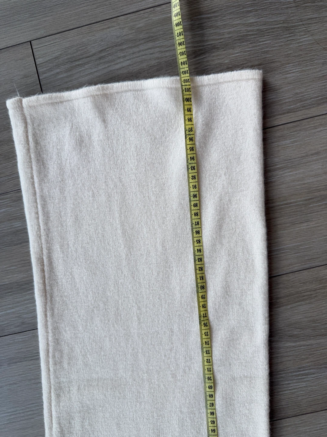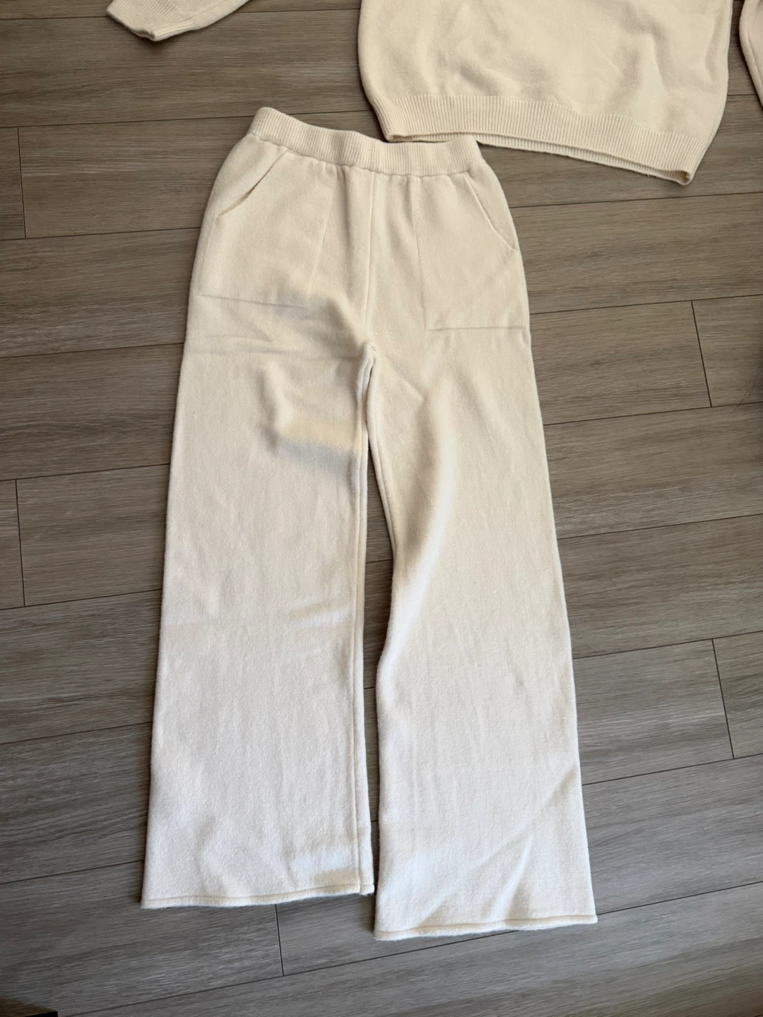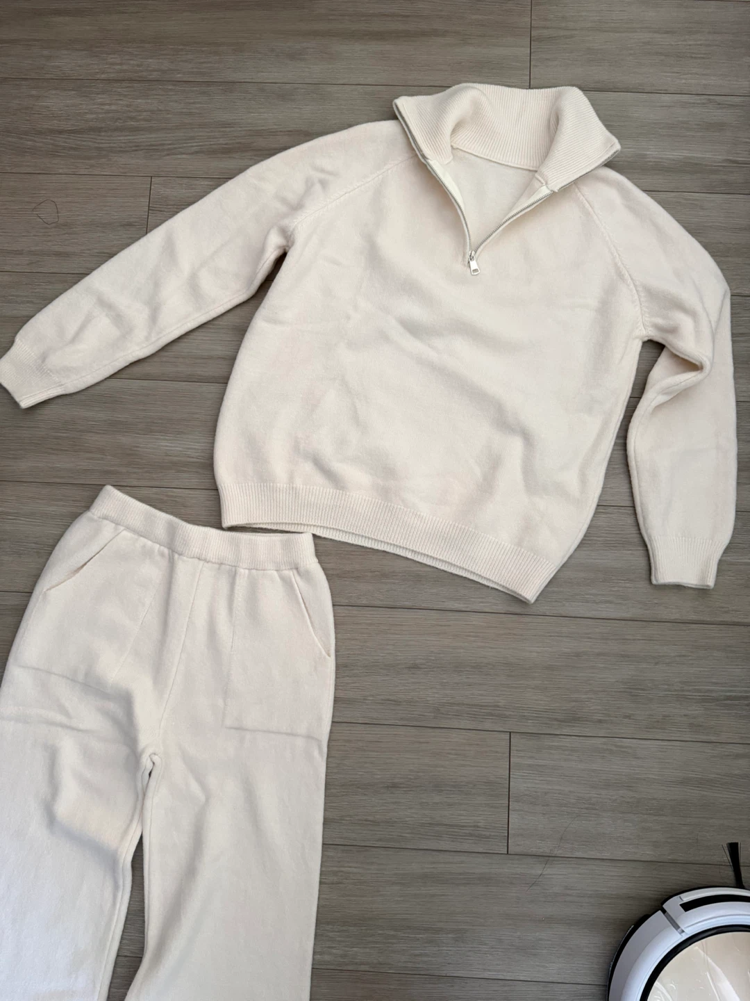 Cream knit quarter-zip sweater and matching pants. Sweater chest measures approx. 22 inches. Pants waist measures approx. 14 inches.